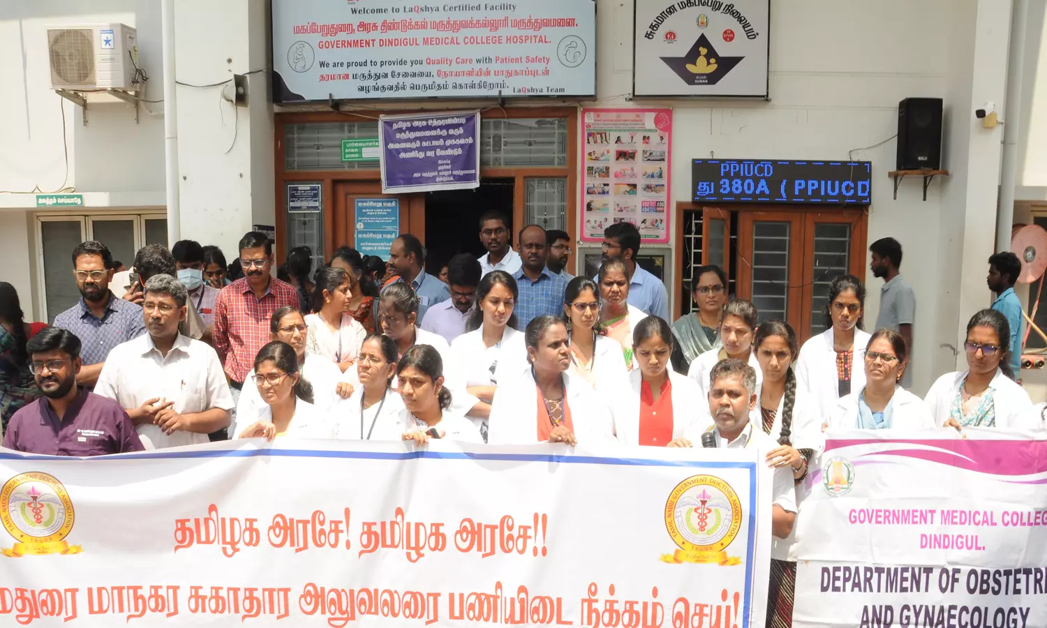 மதுரை அரசு ஆஸ்பத்திரி மகப்பேறு பிரிவில் மதுரை மாநகராட்சி சுகாதார அலுவலர் வினோத் குமார் அத்துமீறி நுழைந்து டாக்டர்கள் மற்றும் பேராசிரியர்களை மரியாதை குறைவாக நடத்தினார். இதனை கண்டித்து திண்டுக்கல் அரசு மருத்துவ கல்லூரி ஆஸ்பத்திரி மகப்பேறு பிரிவு முன்பு தமிழ்நாடு அரசு டாக்டர்கள் சங்கம் சார்பில் டாக்டர்கள் திடீர் தர்ணா போராட்டத்தில் ஈடுபட்டனர்.