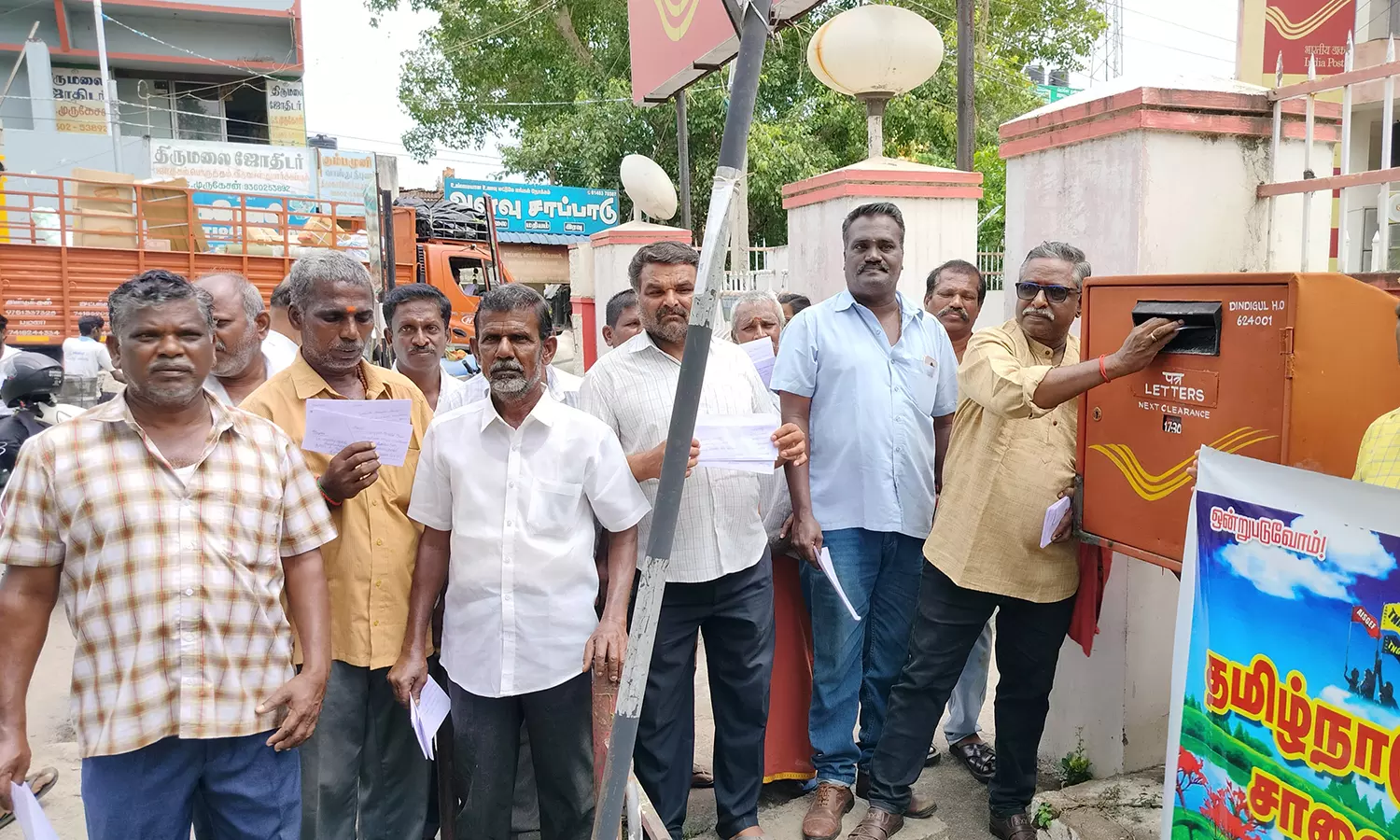- திண்டுக்கல் தலைமை தபால் நிலயைத்தில் முதல்-அமைச்சர், பொதுப்பணி த்துறை அமைச்சர் ஆகியோருக்கு மனு அனுப்பும் போராட்டத்தில் ஈடுபட்டனர்.