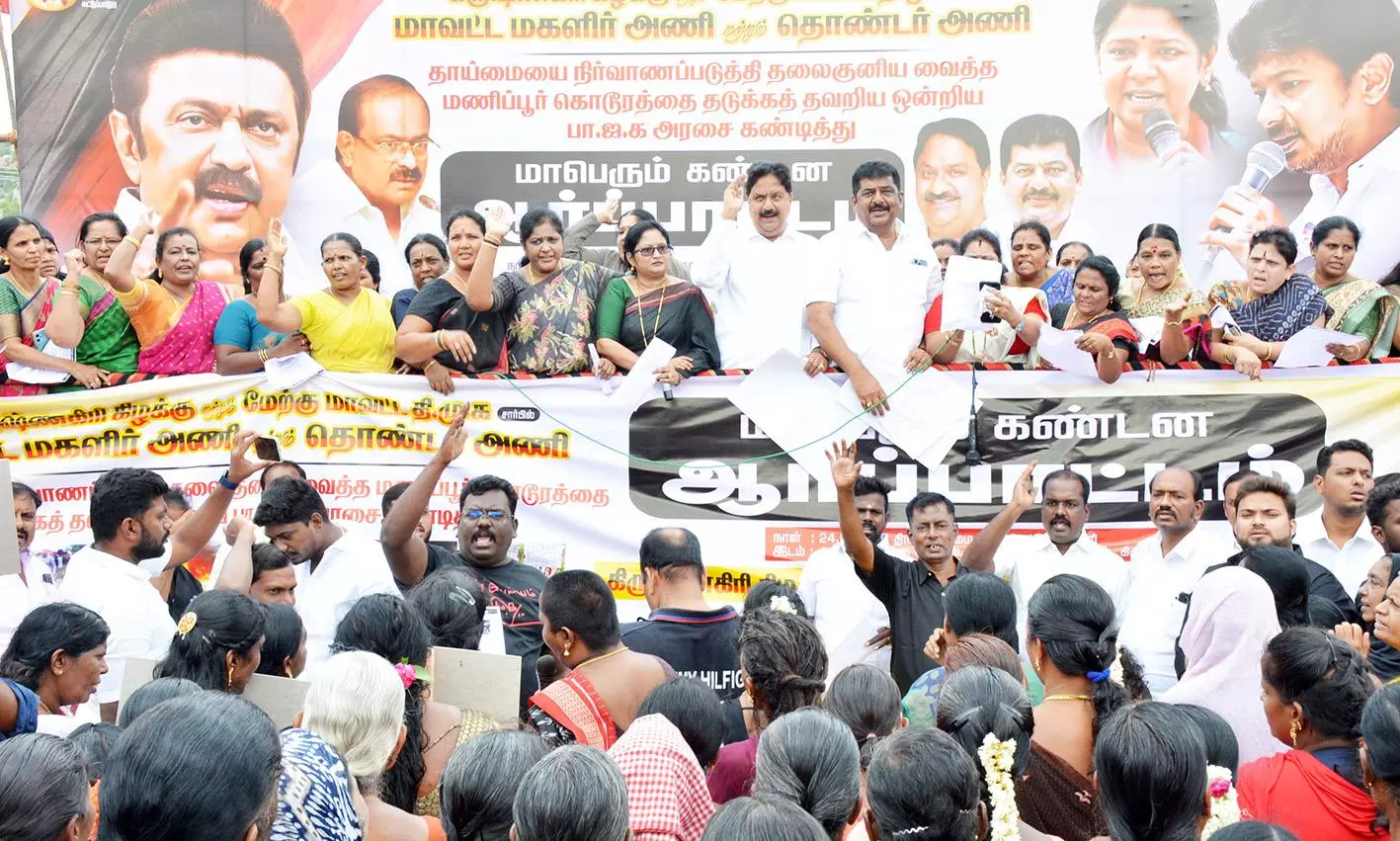 ஆர்ப்பாட்டத்தில் மணிப்பூரில் பெண்களுக்கு எதிராக நடந்த கொடுமைகளை கண்டித்தும், அதை தடுக்க தவறியதாக பா.ஜனதா அரசை கண்டித்தும் கோஷங்கள் எழுப்பப்பட்டன.