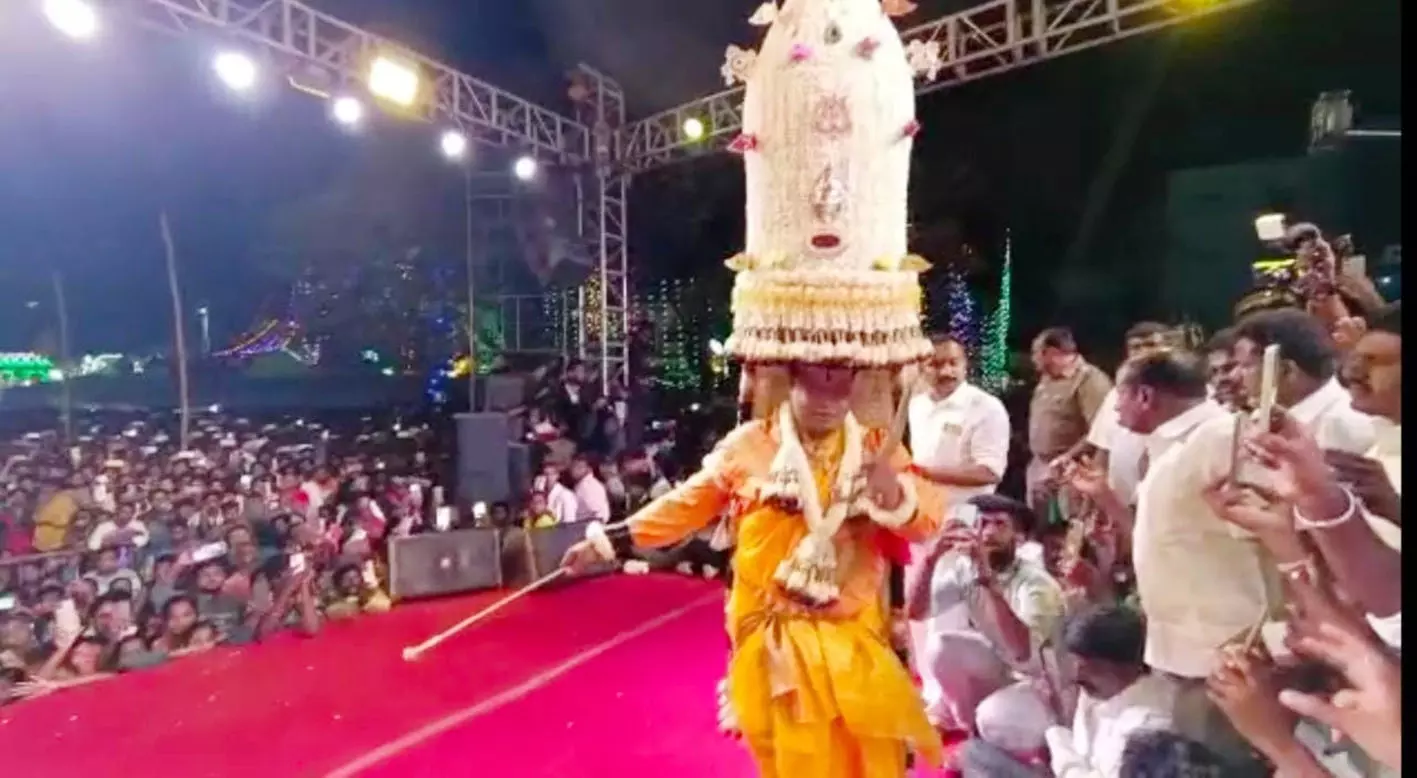 - 48 கிலோ எடை கொண்ட திரவுபதி அம்மன் பூங்கரகத்தை சூடாபுரத்தை சேர்ந்த கிருஷ்ணமூர்த்தி என்ற பூசாரி சுமந்து நடனம் ஆடினார்.