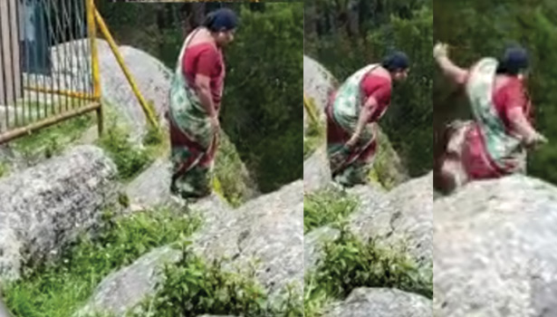 இதனை பார்த்த சுற்றுலா பயணிகள், சத்தம் போட்டு அவரை அங்கிருந்து வருமாறு கத்தினர். ஆனால் அவர் எதனையும் காதில் வாங்கி கொள்ளாமல், அங்கேயே நின்றிருந்தார்.சிறிது நேரத்தில், மூதாட்டி திடீரென பாறையில் இருந்து 500 அடி பள்ளத்திற்குள் குதித்தார். இதனை அங்கிருந்த சுற்றுலா பயணி ஒருவர் பார்த்து வீடியோ எடுத்துள்ளார்.