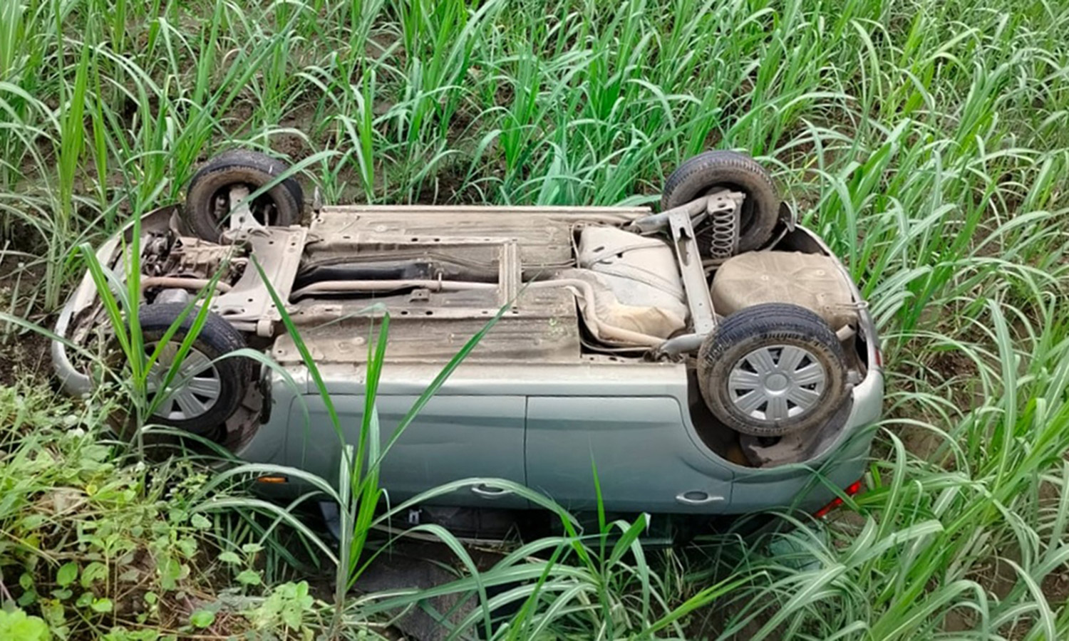 கரும்பு தோட்டத்தில் பள்ளத்தில் பாய்ந்து தலைகுப்புற கவிழ்ந்த கார்