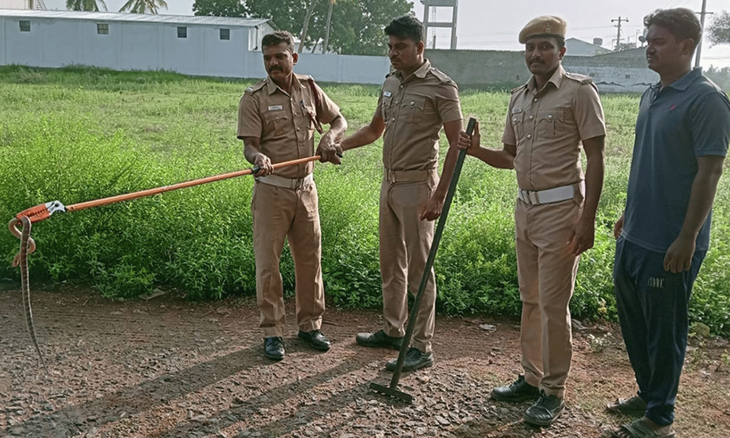 நிலைய அலுவலர் சதீஸ்குமார் தலைமயைில் தீயணைப்பு வீரர்கள் விரைந்து சென்று பாம்பு பிடிக்கும் கருவியின் உதவியுடன் பாம்பை உயிருடன் பிடித்தனர்.