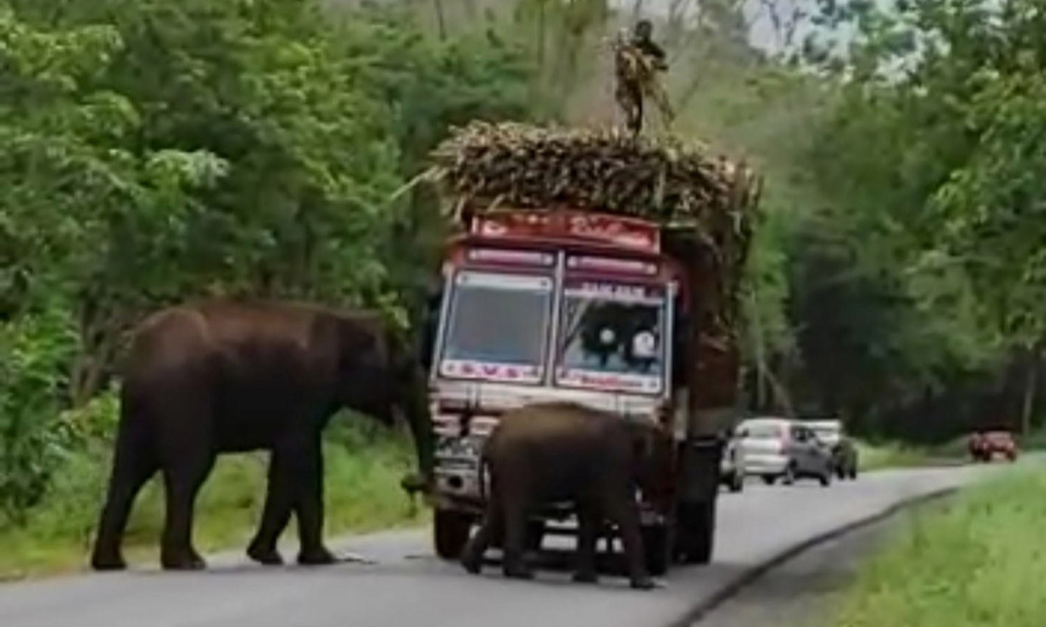 இந்த தேசிய நெடுஞ்சாலையை யானைகள் குட்டிகளுடன் அடிக்கடி கடந்து செல்வது வழக்கம். கடந்த சில நாட்களாக கரும்புகளை தின்பதற்காக யானைகள் குட்டியுடன் சாலையில் உலா வருவதும் வாகனங்களை வழிமறைத்து கரும்புகளை தின்பதும் தொடர்கதையாகி வருகிறது.