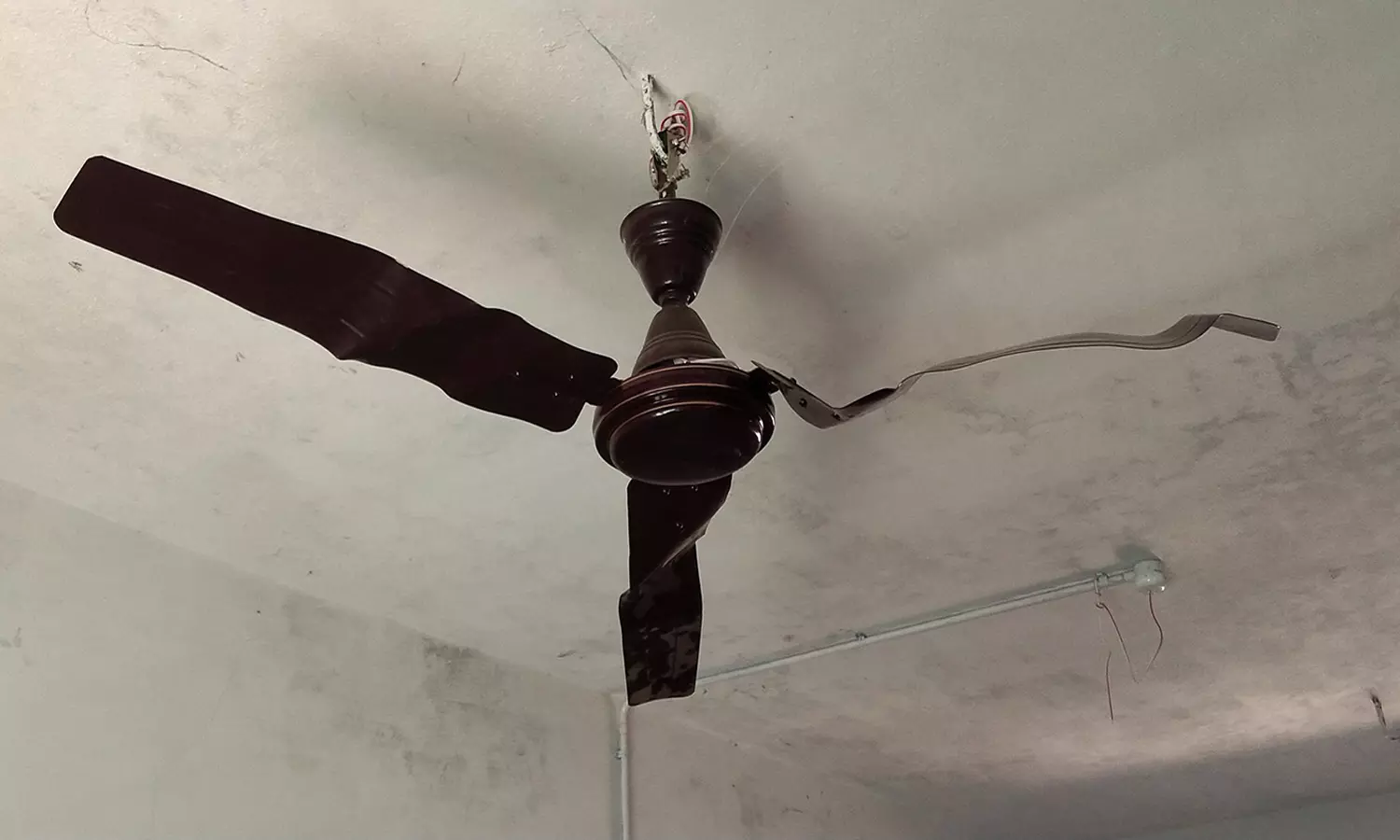 வகுப்பறையில் உள்ள மின்விசிறி சேதப்படுத்தி உள்ள காட்சி.