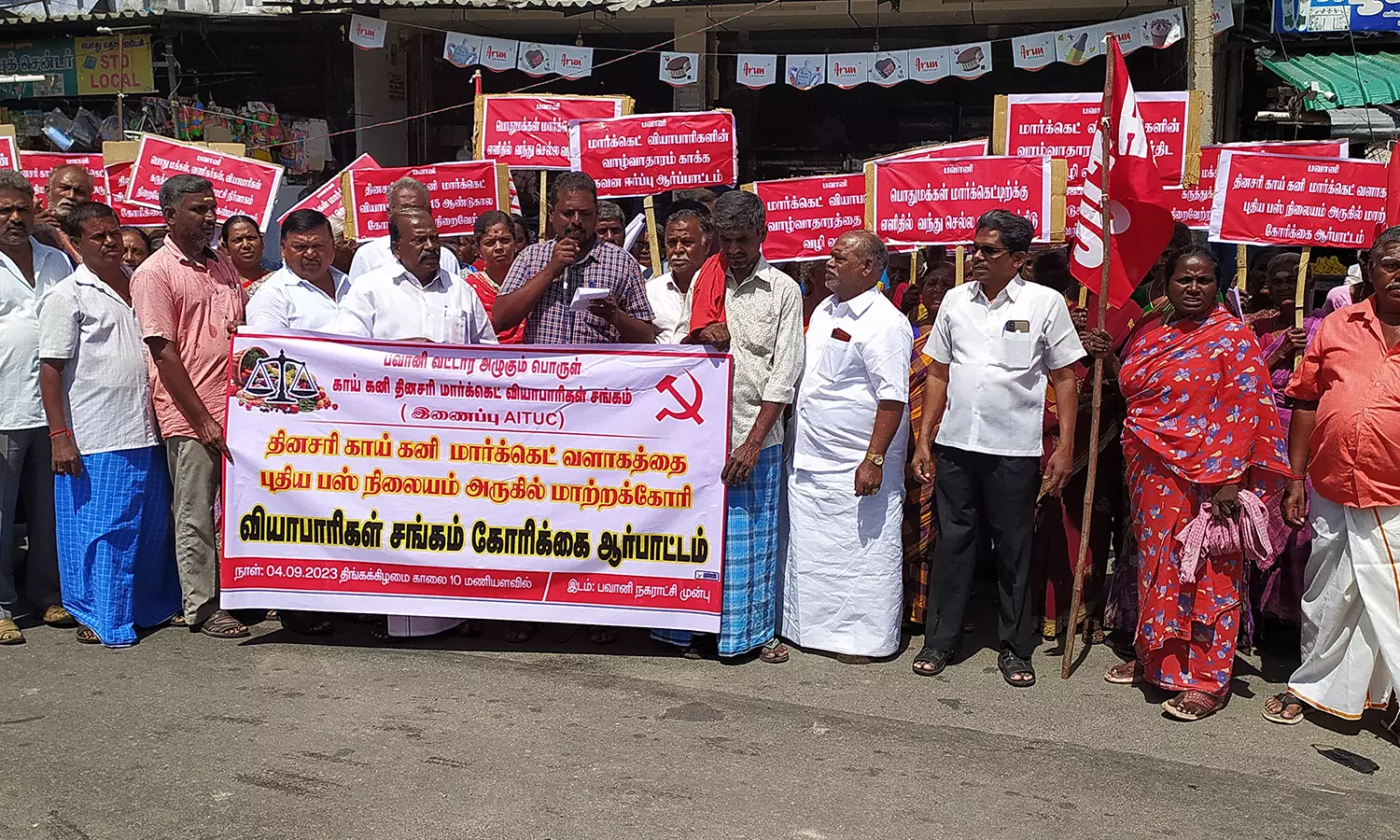 எனவே புதிய பஸ் நிலையம் அருகில் அனைவருக்கும் வாழ்வாதாரம் பாதிக்காமல் புதிய தினசரி காய்கனி மார்க்கெட் வளாகம் கட்டிக் கொடுக்க வேண்டும் என கண்டன கோஷங்கள் போட்டு கண்டன உரையாற்றினர்கள். இந்த கண்டன ஆர்ப்பாட்டத்தில் நகர் மன்ற துணைத் தலைவர் மணி, மாவட்ட செயலாளர் சிவராமன், தலைவர் சந்திரசேகர், பவானி வட்டார ஏ.ஐ.டி.யு.சி. தினசரி காய்கனி மார்க்கெட் அழுகும் பொருள் வியாபாரிகள் சங்க நிர்வாகிகள் சண்முகம், தனக்கொடி, மாதேஸ்வரன், கார்த்தி, சரவணன் உட்பட 100-க்கும் மேற்பட்டவர்கள் கலந்து கொண்டனர்.