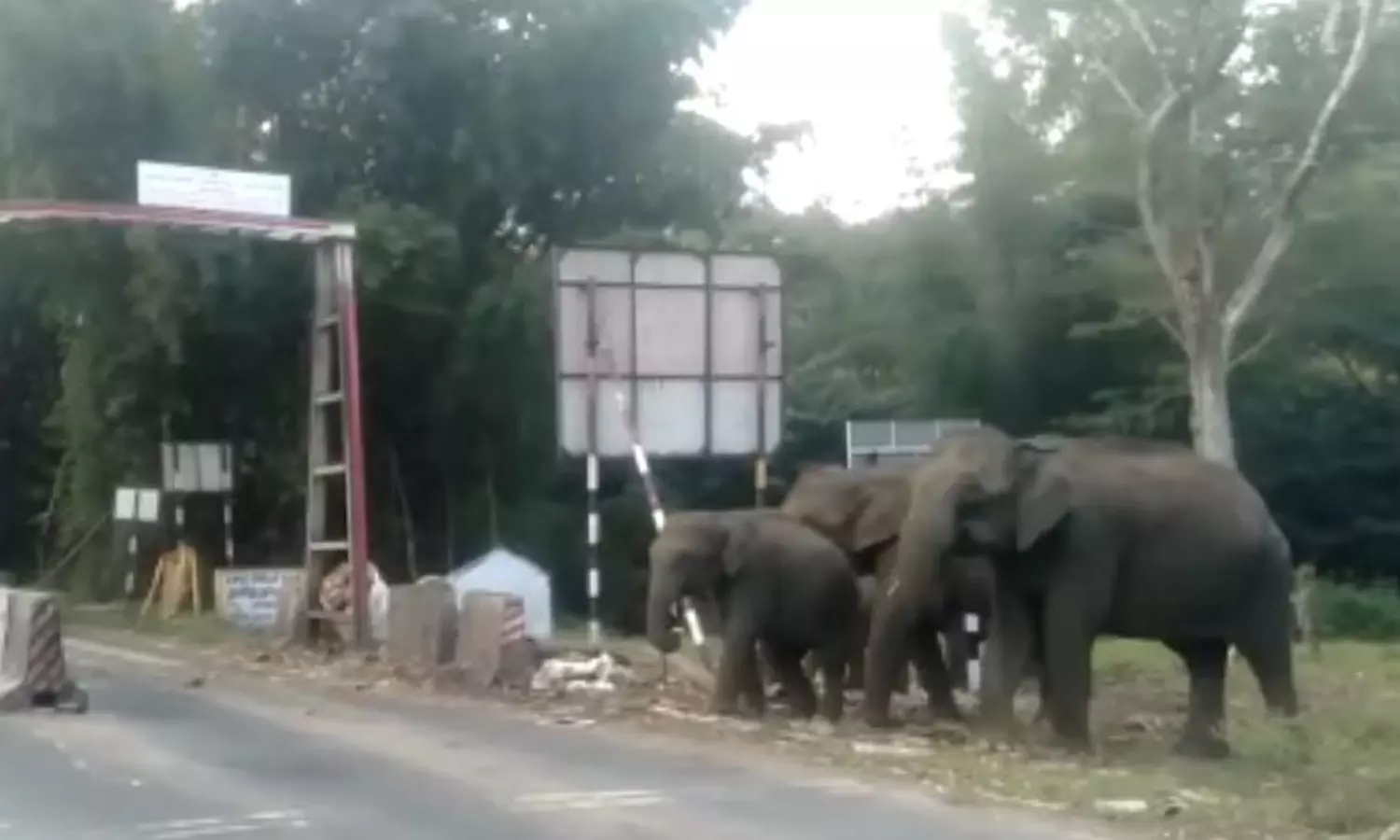 கரும்புகளை ஏற்றி வரும் லாரிகளுக்காக யானைகள் காத்திருக்கின்றன. பின்னர் கரும்புகளை ஏற்றி வரும் லாரிகளை வழிமறித்து கரும்புகளை சாப்பிட்டு வருகின்றன.