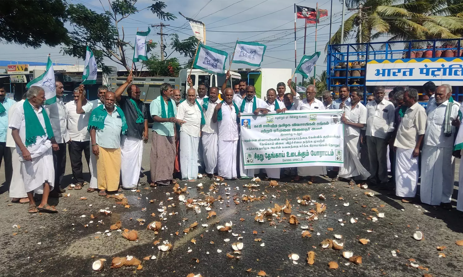 தேங்காய்க்கு உரிய விலை கேட்டு விவசாயிகள் தேங்காய் உடைத்து போராட்டம்