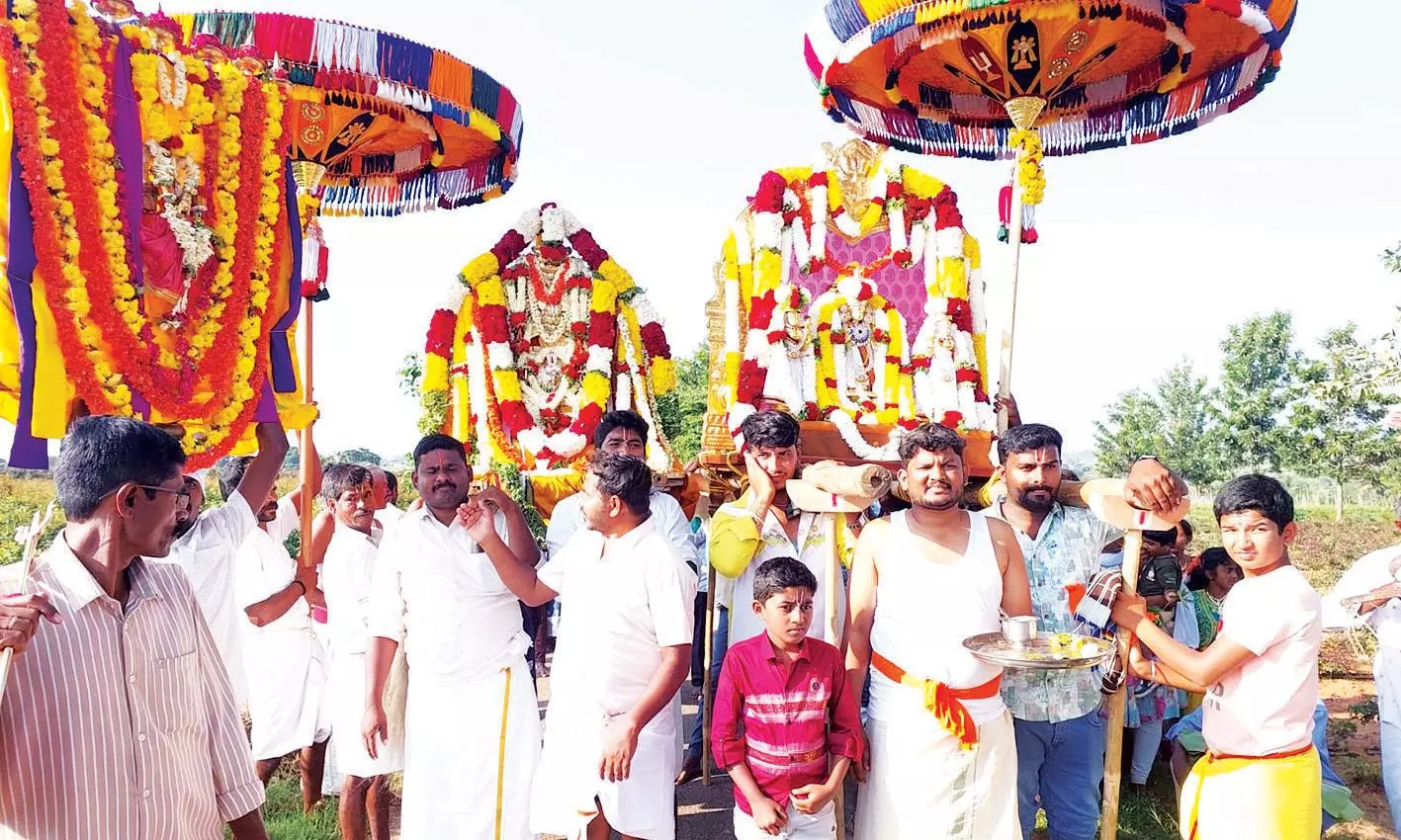 மணியம்பாடி மெலூர் ஒட்டர்பாளையம் ஆகிய கிராம மக்கள் சார்பில் விவசாயம் செழிக்கவும், மக்கள, நொடியின்றி வாழவும் கிராம தேவதை–களுக்கு திருவிழா நடத் தப்பட்டு வருகிறது. இந்த ஆண்டு தசரா திருவிழாவை முன்னிட்டு மணியம்பாடியில் உள்ள கிராம தேவதைகளான பட்டாளம்மன், மாரி–யம்மன், மெலூர் கிரா–மத்தில் சிக்கம்மா, தொட்டம்மா, பசுவேஸ்வர சாமி, வீரபத்திர சாமி, பட்டா ளம்மன், ஓம்காளியம்மன், மாரியம்மன், வெங்கடராம சுவாமி, ஒட்டர்பாளையம் கிராமத்தில் உள்ள திம்ம–ராய சாமி, சென்றாய சாமி, வீரபத்திர சாமி உட்பட பல்வேறு கிராம தேவதைகளை அலங்க–ரிக்கப்பட்டு சிறப்பு பூஜைகள் செய்து மேள, தாளங்கள் முழங்க அலங்கரிக்கபட்ட எருதுகளுடன் ஊர்வலமாக தோள்களில் சுமந்தவாறு புறப்பட்ட பக்தர்கள் மணியம்பாடி கிராமத்திற்கு வந்தடைந்தனர்.