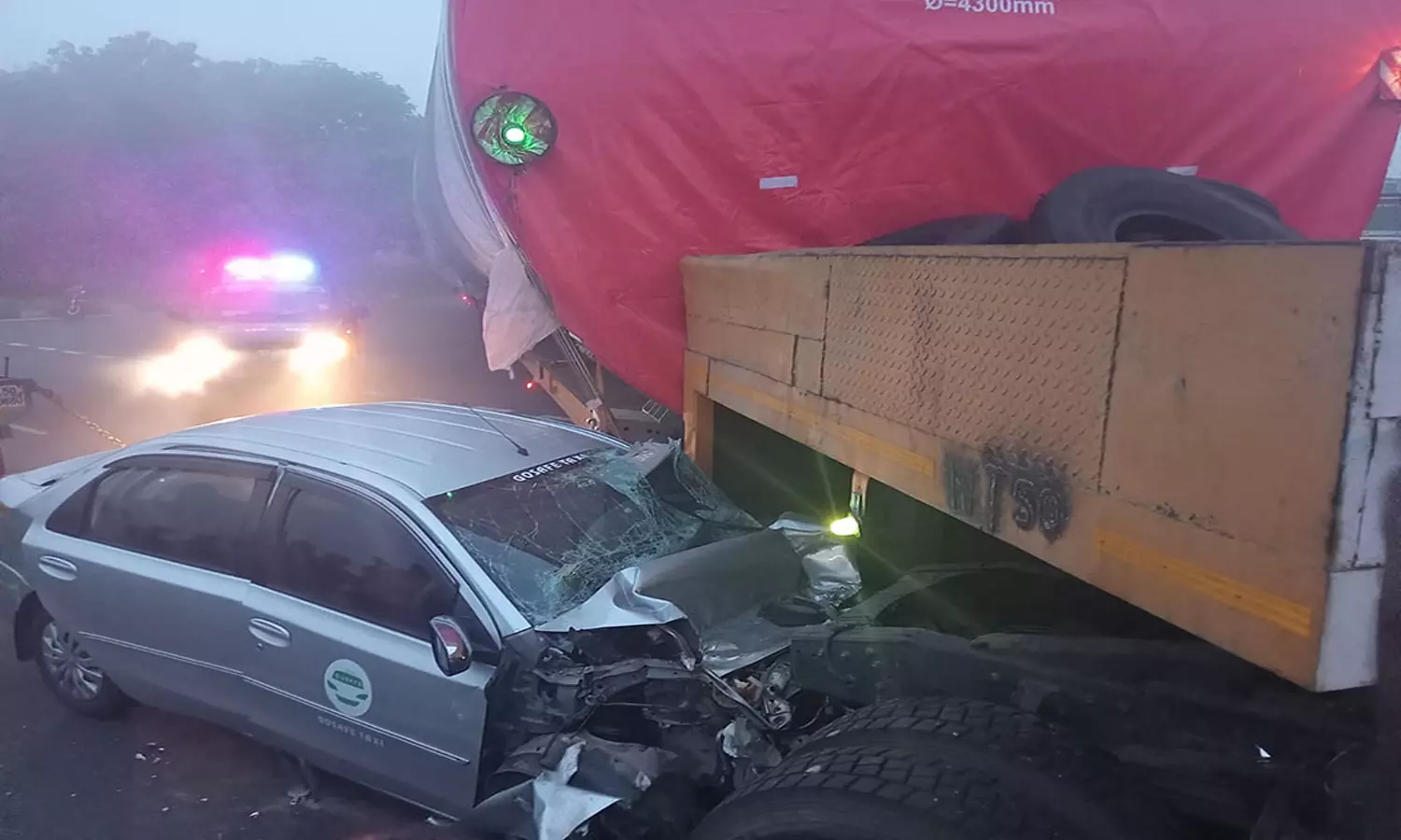 கார், லாரி மீது கார் மோதி நிற்கும் காட்சி.