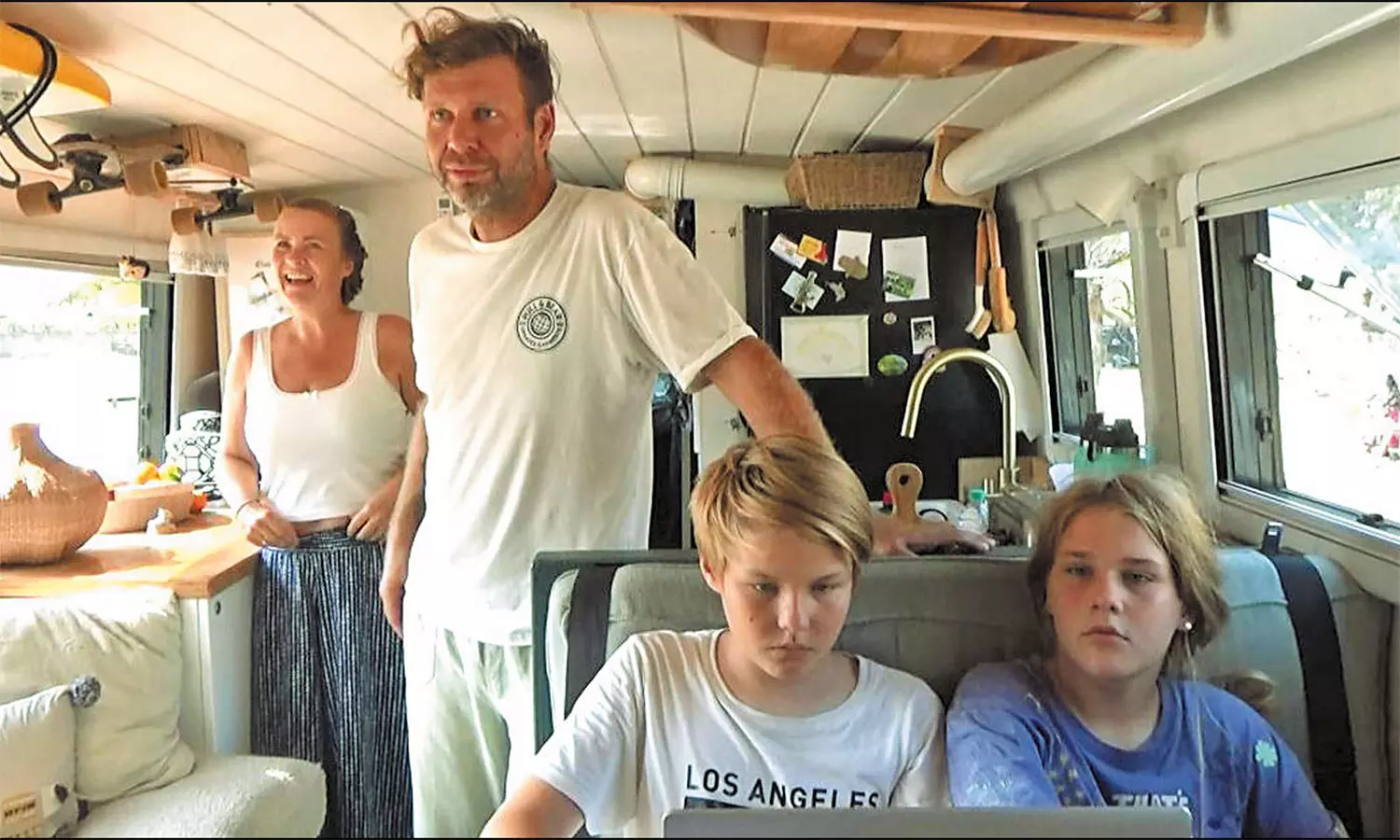 இவர்களது மகன் பென், மகள் லெனி இருவரும் தினமும் சொகுசு பஸ்சிலேயே லேப்-டாப் மூலம் 6 மணி நேரம் ஆன்லைன் வகுப்பு படிக்கின்றனர்.