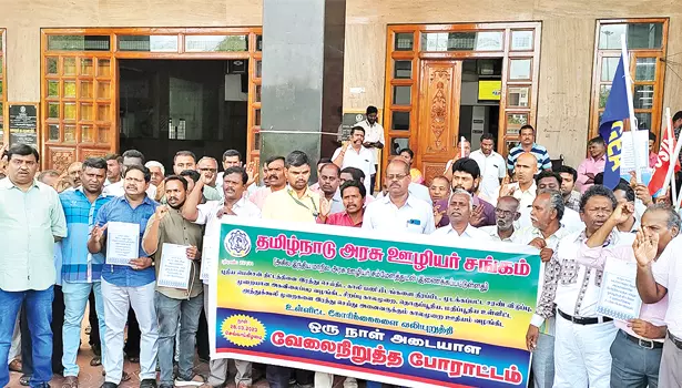 புதிய பென்ஷன் திட்டத்தை ரத்து செய்ய வேண்டும், காலிப் பணியிடங்களை நிரப்ப வேண்டும், அனை வருக்கும் காலமுறை ஊதியம் வழங்க வேண்டும் என்பன உள்ளிட்ட பல்வேறு கோரிக்கைகளை வலியுறுத்தி தமிழ்நாடு அரசு ஊழியர் சங்கத்தின் சார்பில் ஒரு நாள் அடையாள வேலை நிறுத்தம் இன்று நடந்தது.