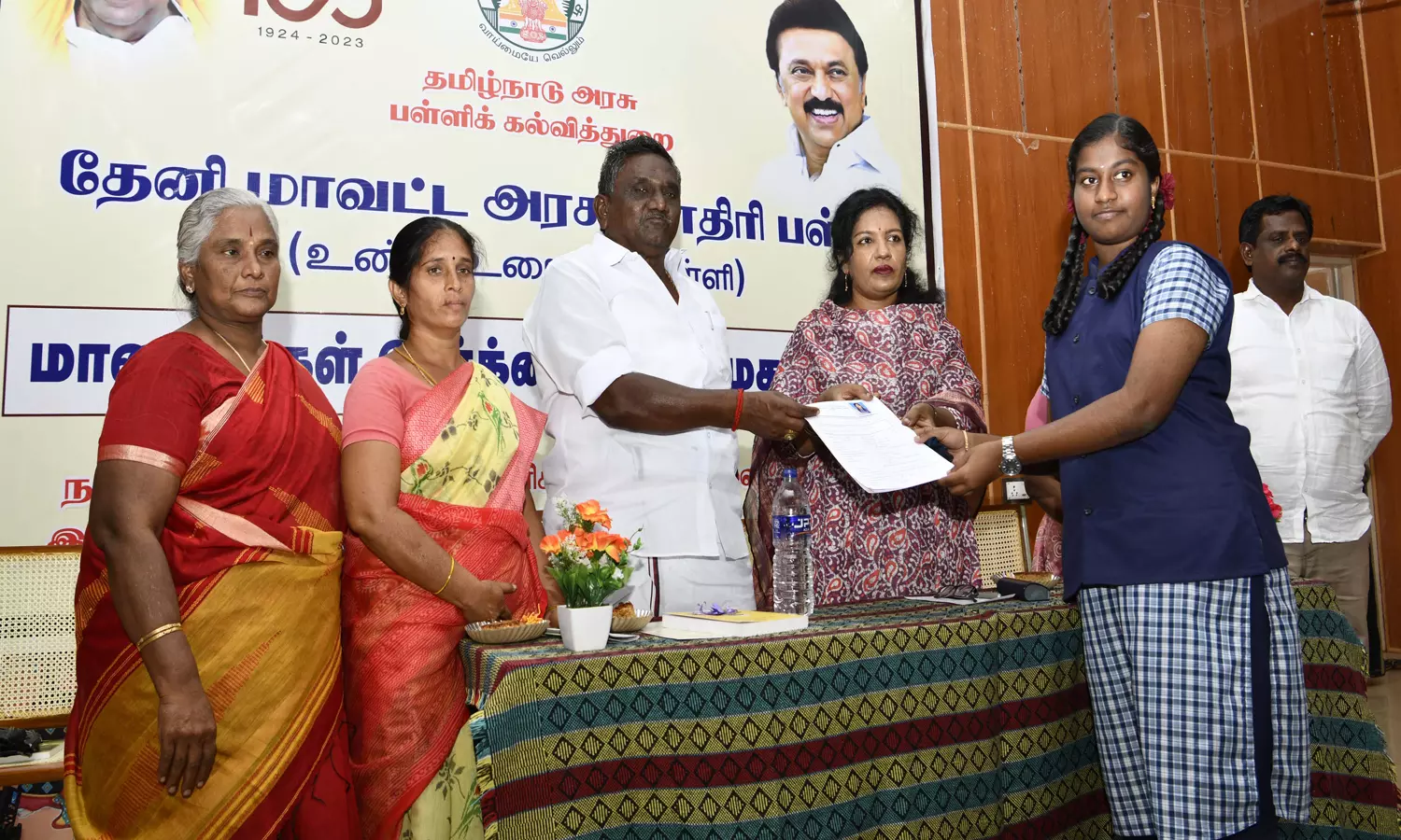 கலெக்டர் ஷஜீவனா மற்றும் ஆண்டிபட்டி எம்.எல்.ஏ. மகாராஜன் ஆகியோர் மாணவிக்கு அரசு மாதிரி பள்ளியில் சேர்க்கைக்கான ஆணையினை வழங்கினார்.