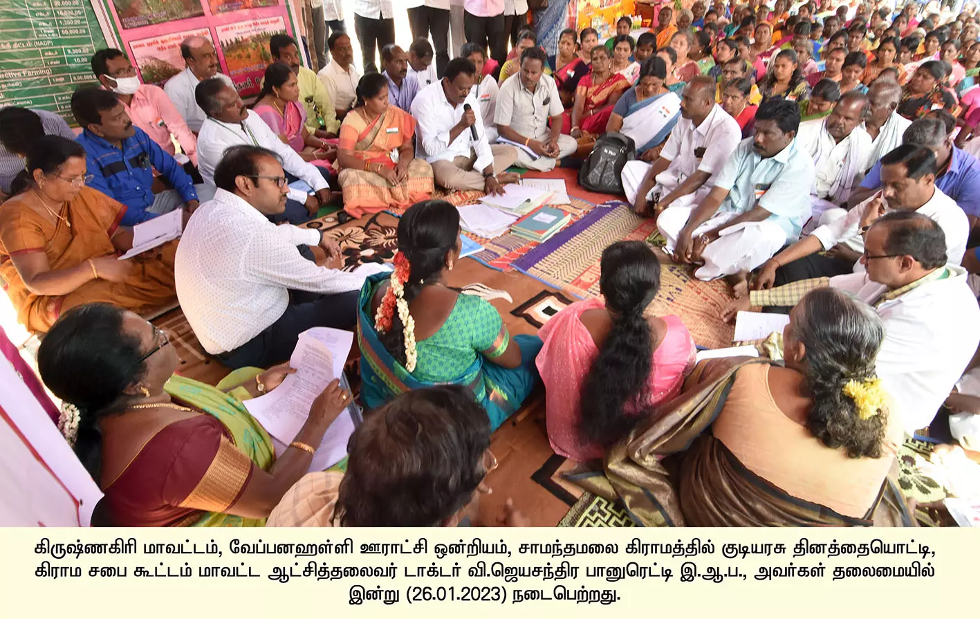 கிருஷ்ணகிரி மாவட்டம் வேப்பனப்பள்ளி ஒன்றியத்திற்குட்பட்ட சாமந்தமலை கிராமத்தில் குடியரசு தினத்தையொட்டி கிராம சபை கூட்டம் நடந்தது. இந்த கூட்டத்திற்கு கலெக்டர் ஜெயசந்திரபானு ரெட்டி தலைமை தாங்கினார். கூட்டத்தில் மகாத்மா காந்தி தேசிய ஊரக வேலைவாய்ப்பு திட்டத்தின் கீழ் கிராமத்திற்கு செயல்படுத்தப்பட வேண்டிய பணிகள் குறித்தும், பிளாஸ்டிக் பயன்பாடு முற்றிலும் தவிர்ப்பது, அனைத்து வீடுகளிலும் திடக் கழிவுகளை தரம் பிரிப்பதை உறுதி செய்தல் மற்றும் 2023-24 ஆம் ஆண்டில் புதியதாக தேர்வு செய்யப்பட வேண்டிய பணிகள் குறித்தும் விவாதிக்கப்பட்டது.