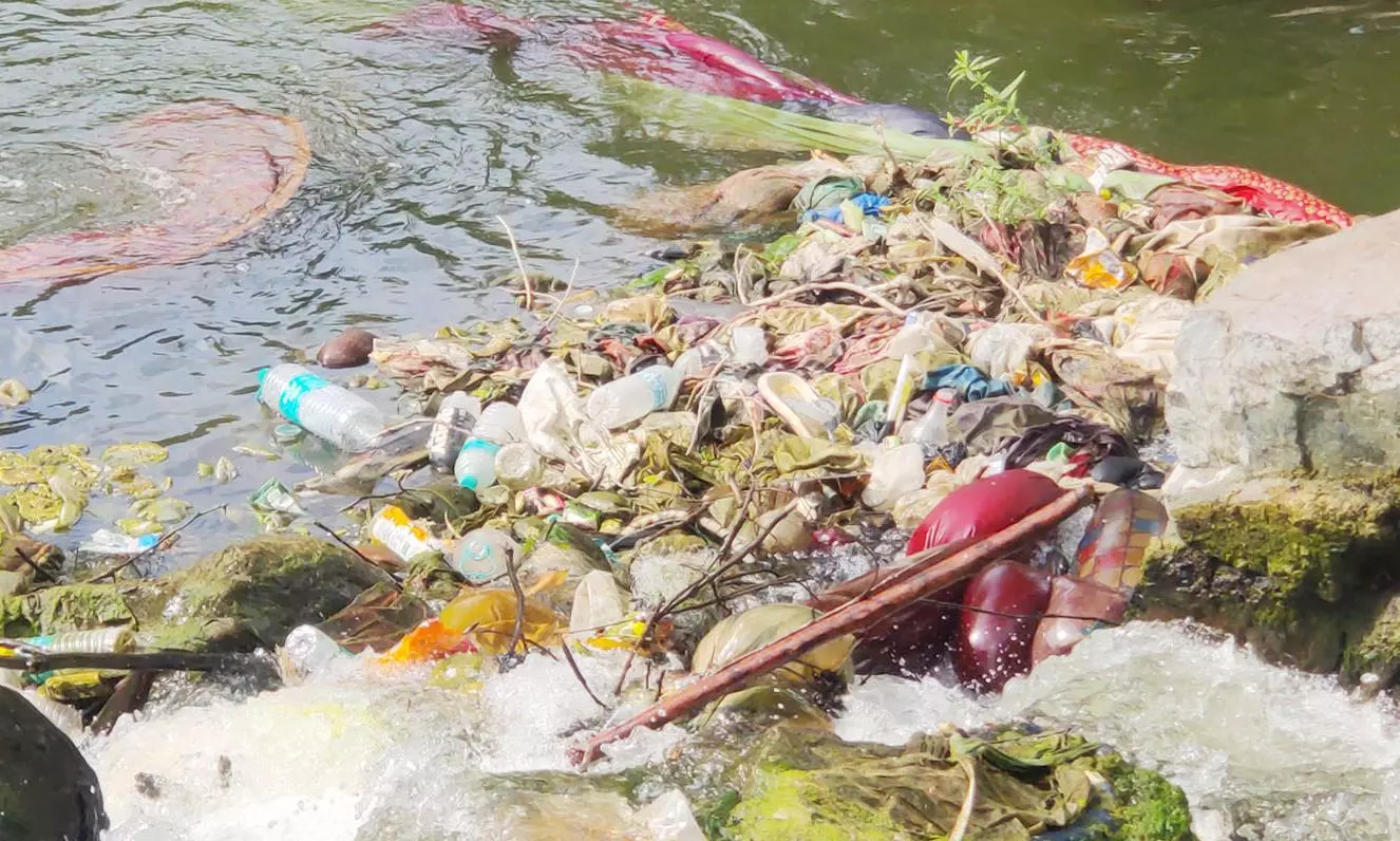 காவிரி ஆற்றில் குவிந்து கிடக்கும் பிளாஸ்டிக் கழிவுகள், ஆடைகளை படத்தில் காணலாம்.