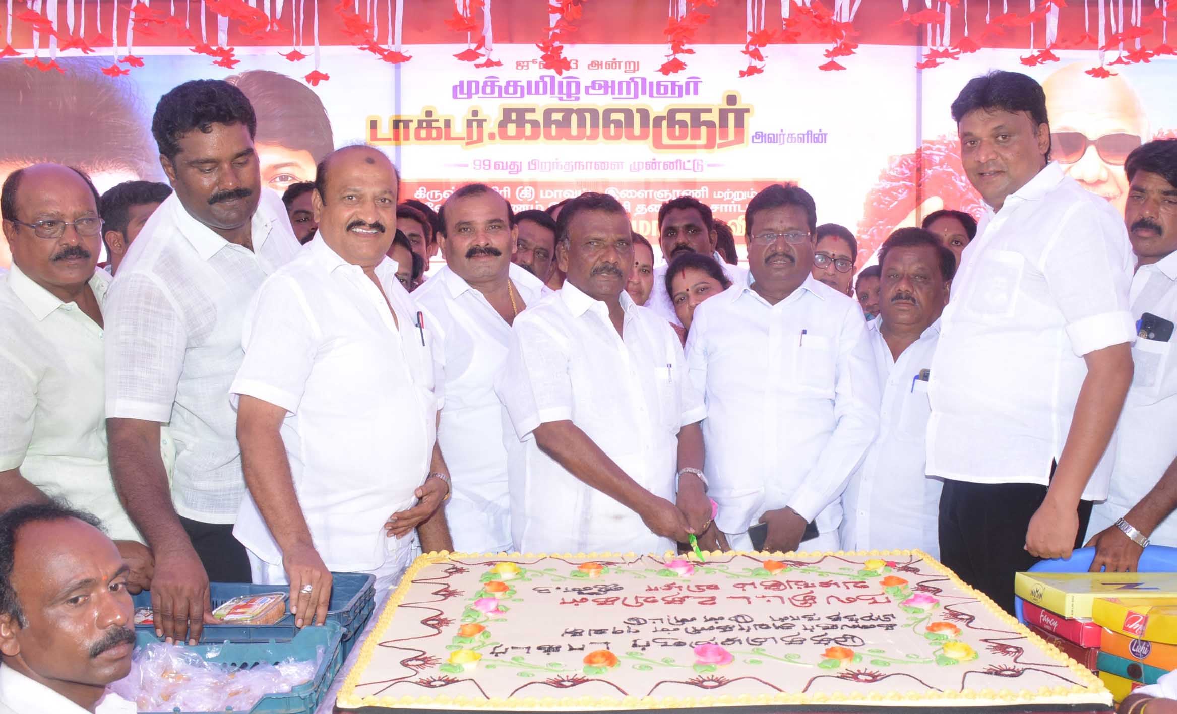 கருணாநிதி பிறந்த நாளையொட்டி கேக் வெட்டி கொண்டாடப்பட்டது.