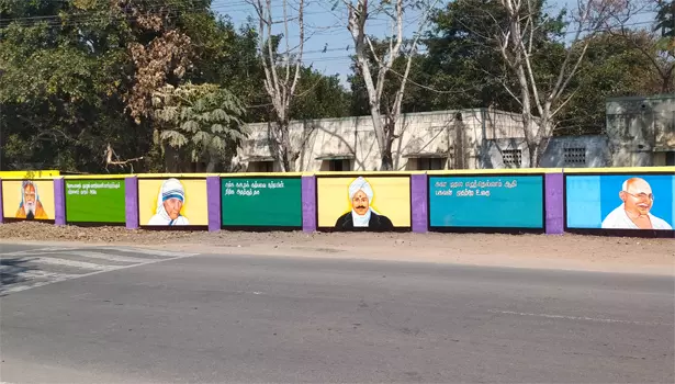 சுற்றுச்சுவரில் எழுதப்பட்டுள்ள திருக்குறள் மற்றும் தேசிய தலைவர்களின் பல வண்ண ஓவியங்கள்.