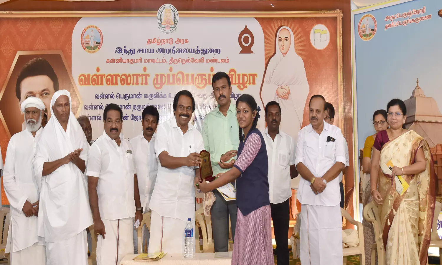 நாகர்கோவிலில் நடந்த வள்ளலார் முப்பெரும் விழாவில், போட்டியில் வெற்றி பெற்ற மாணவிக்கு அமைச்சர் மனோ தங்கராஜ் பரிசு வழங்கியபோது எடுத்த படம்.