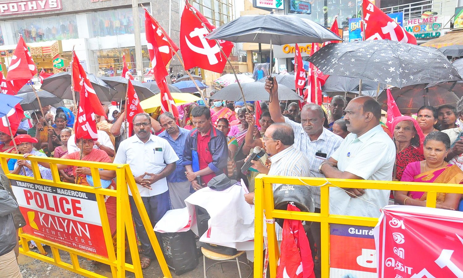 நாகர்கோவிலில் இன்று கொட்டும் மழையில் விவசாய தொழிலாளர்கள் ஆர்ப்பாட்டம் - நகர்புற வேலைவாய்ப்பு திட்டத்தை மாநகராட்சிக்கும் விரிவுபடுத்த கோரிக்கை