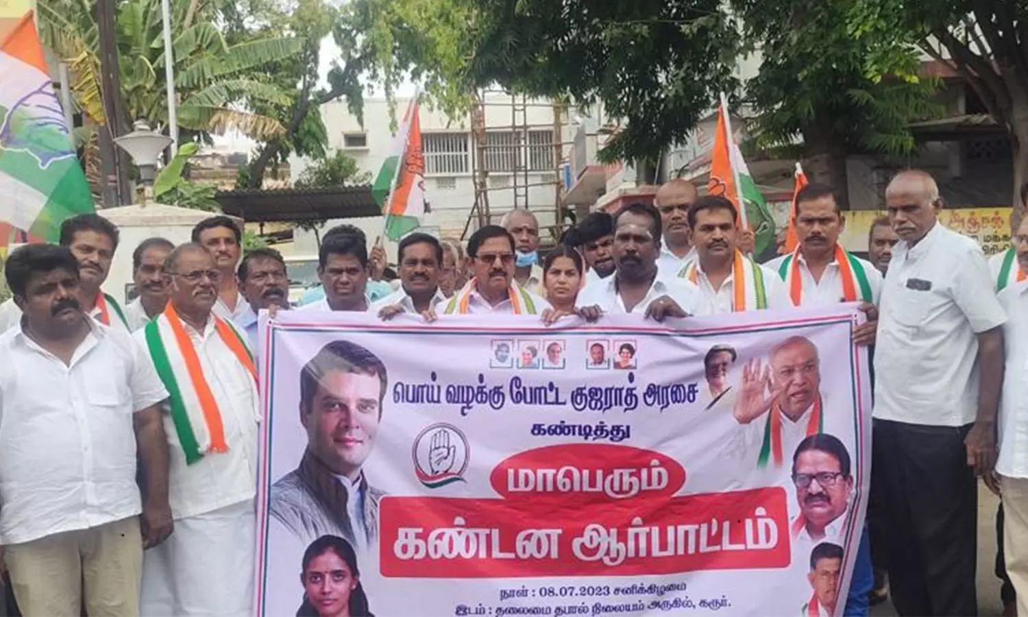 கரூர் மாவட்ட காங்கிரஸ் கமிட்டியின் சார்பில் ராகுல் காந்தி மேல்முறையீட்டு மனுவை தள்ளுபடி செய்ததை கண்டித்து கரூர் தலைமை தபால் நிலையம் முன்பு காங்கிரஸ் கட்சியினர் மாபெரும் கண்டன ஆர்ப்பாட்டம் நடத்தினர். இந்த ஆர்ப்பாட்டத்திற்கு மாநகர தலைவர் வெங்கடேஸ்வரன் தலைமை தாங்கினார். கரூர் மாநகராட்சியின் 9-வது மாமன்ற உறுப்பினரும் கரூர் வடக்கு நகர காங்கிரஸ் தலைவருமான ஸ்டீபன் பாபு முன்னிலை வகித்தார். இந்நிகழ்ச்சியில் முன்னாள் மாவட்ட தலைவர் பேங்க் சுப்ரமணியம், மாவட்ட சேவாதள தலைவர் தாந்தோண்றி குமார், மாவட்ட துணை தலைவர்கள் கோகுலே, ஜாகிர் உசேன், அரவக்குறிச்சி நகர் மன்ற உறுப்பினர் பஜிலா பானு, நகரத் துணைத் தலைவர்கள் பாலமுருகன், வீரராக்கியம் மாணிக்கம், சுப்பன், ரவி மற்றும் நிர்வாகிகள் பலர் கலந்து கொண்டனர். முடிவில் நகரத் துணைத் தலைவர் கண்ணப்பன் நன்றி கூறினார்.