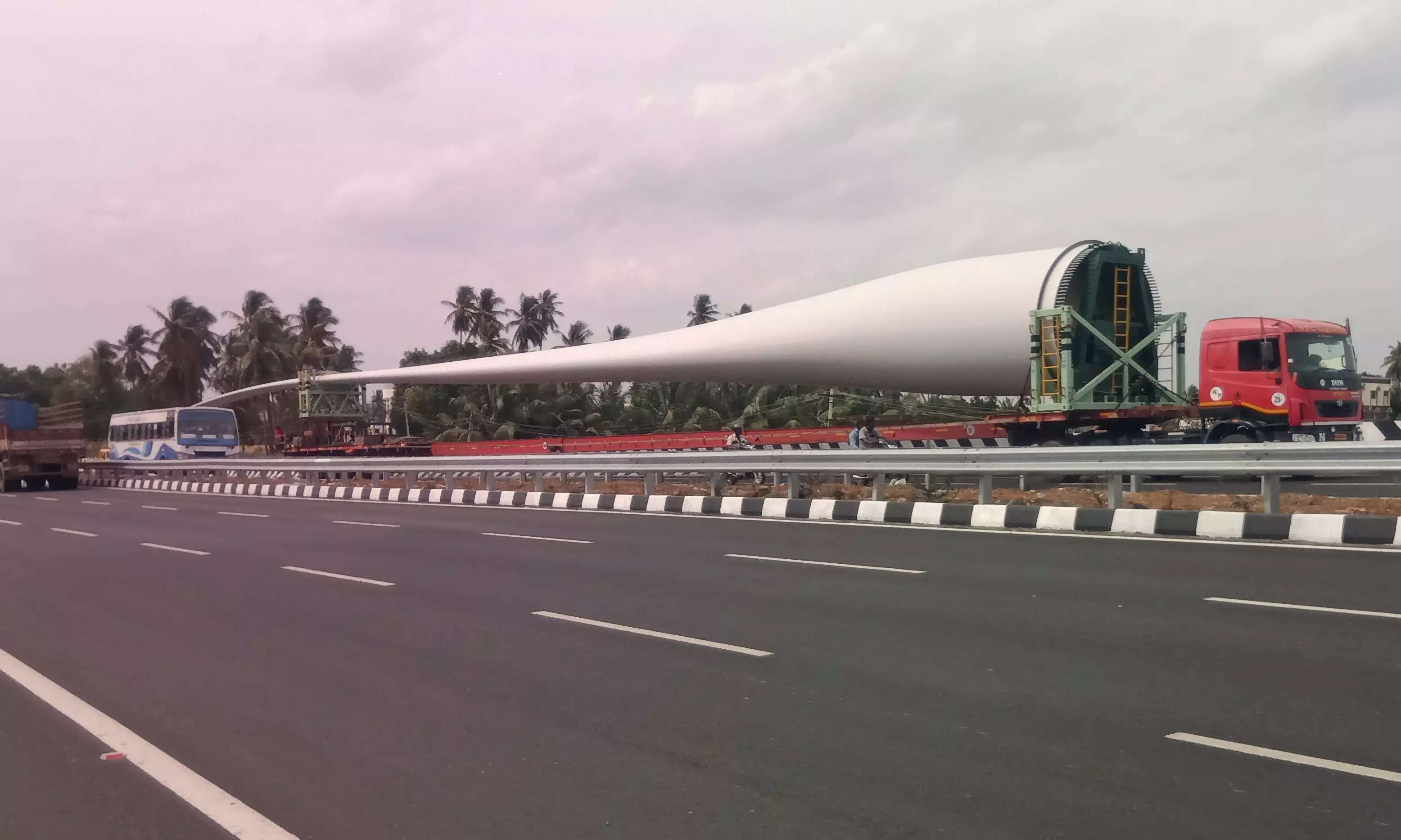 காற்றாலை விசிறி இறக்கைகளை ஏற்றி செல்லும் லாரிகளால் போக்குவரத்து பாதிப்பு