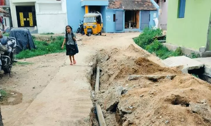 தற்போது வரை குடிநீர் குழாய் பதிக்க தோண்ட ப்பட்ட குழிகள் பெரும்பா லும் மூடப்ப டாமலும் திறந்த வெளியில் காணப்படுவதால் இருசக்கர வாகன ஓட்டிகள் மற்றும் பள்ளி கல்லூரி மாணவர்கள், முதியவர்கள் என அடிக்கடி குழியில் விழுந்து விபத்து ஏற்படடு வருகிறது.
