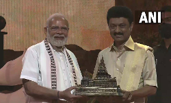பிரதமர் மோடிக்கு மாமல்லபுரம் சிற்பத்திலான நினைவுப் பரிசை முதலமைச்சர் மு.க.ஸ்டாலின் வழங்கினார்.