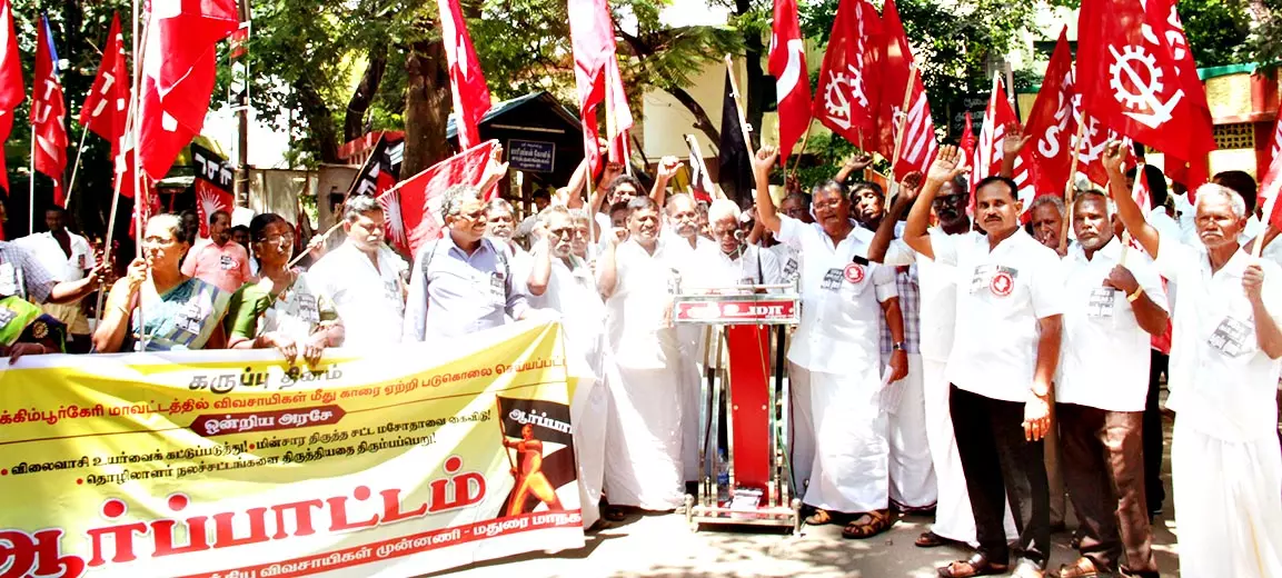 விவசாயிகள் படுகொலைக்கு காரண மானவர் மீது வழக்குபதிந்து நடவடிக்கை எடுக்க வேண்டும், விலைவாசி உயர்வை கட்டுப்படுத்த வேண்டும், மின்சார திருத்த சட்ட மசோதாவை கைவிட வேண்டும், தொழிலாளர் நல சட்டங்களை திருத்தி யதை திரும்பப்பெற வேண் டும், அனைத்து தொழிலா ளர்களுக்கும் குறைந்த பட்ச சம்பளம் ரூ.26 ஆயிரமாக நிர்ணயம் செய்ய வேண்டும் ஆகிய கோரிக்கைகளை வலியுறுத்தி கோஷங்கள் எழுப்பப்பட்டது.