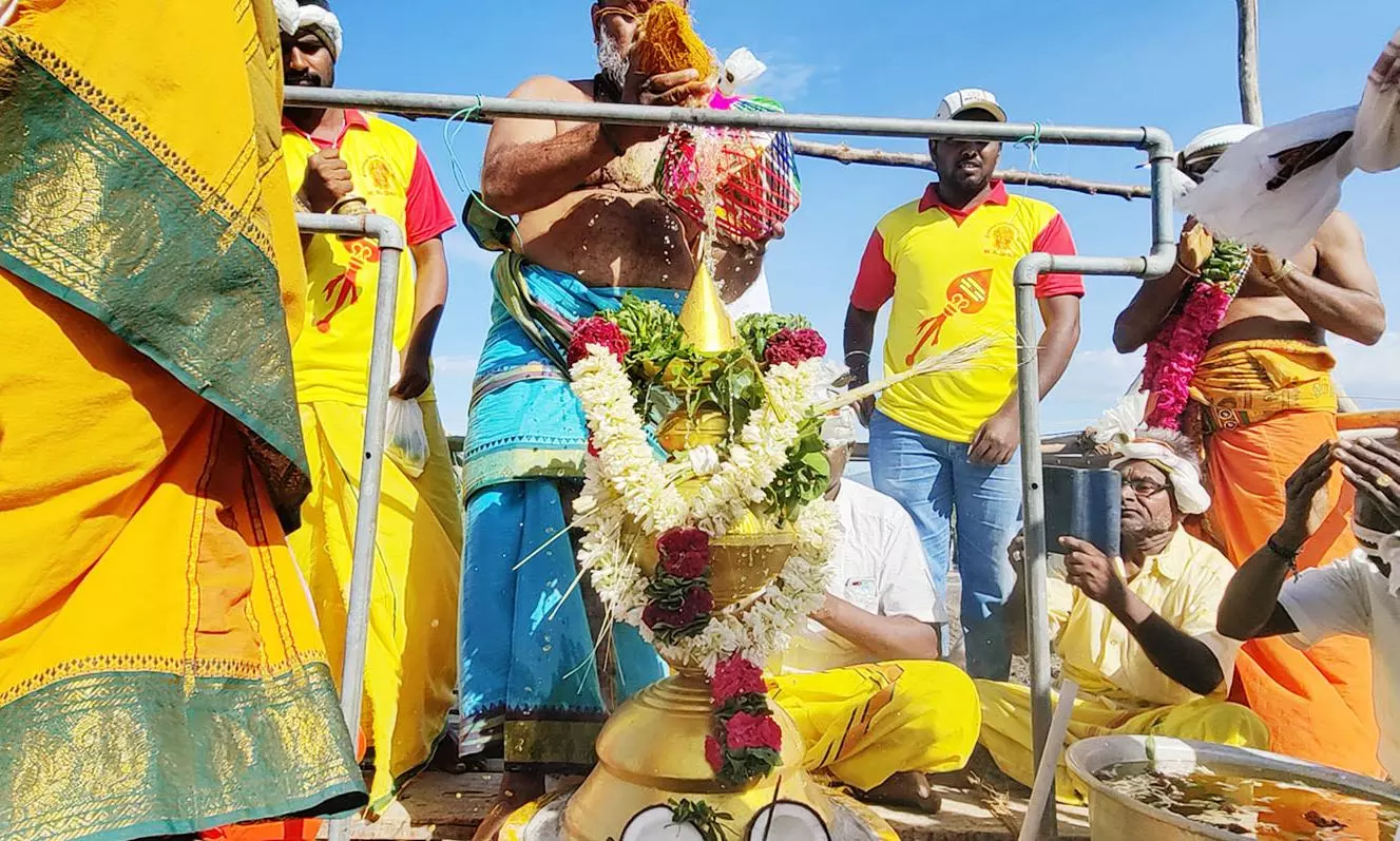 கோபுர கலசத்திற்கு சிவாச்சாரியார்கள் புனித நீர் ஊற்றிய காட்சி.
