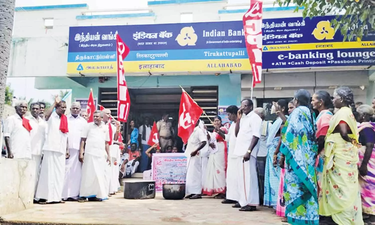 - பேரணியாக வந்து வங்கி முன்பு பாத்திரங்களை வைத்து ஆர்ப்பாட்டம் செய்தனர்.