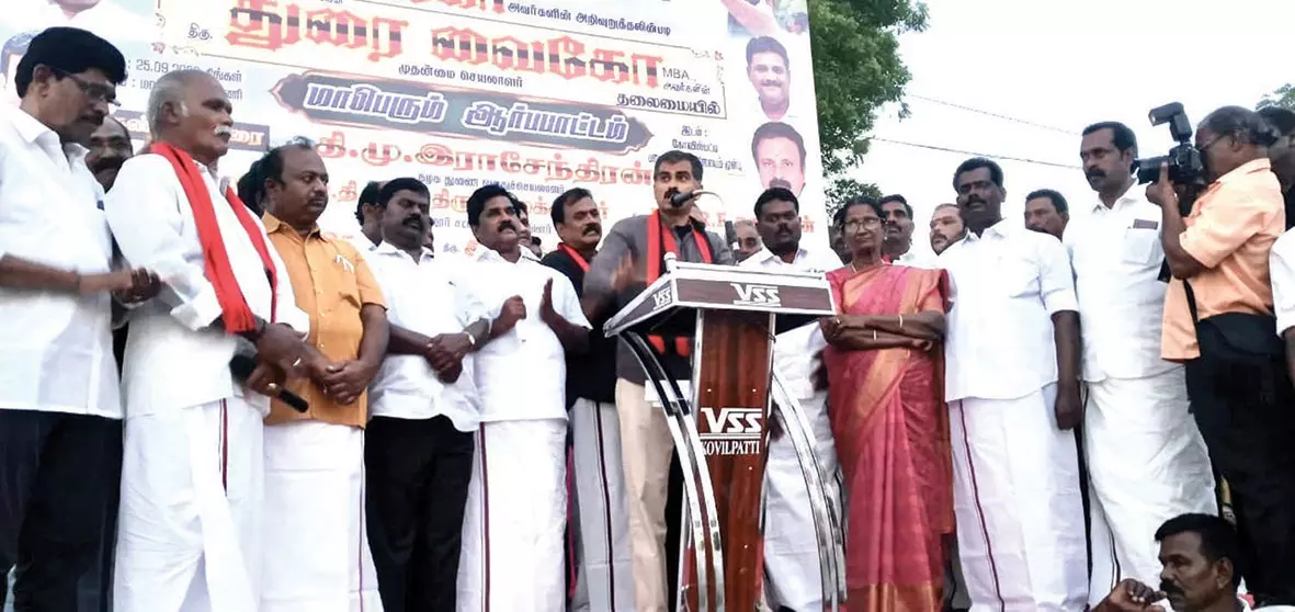 ஆர்ப்பாட்டத்தில் ம.தி.மு.க. முதன்மை செயலாளர் துரை வைகோ பேசிய காட்சி. அருகில் வடக்கு மாவட்ட செயலாளர் ஆர்.எஸ்.ரமேஷ் மற்றும் பலர் உள்ளனர்.