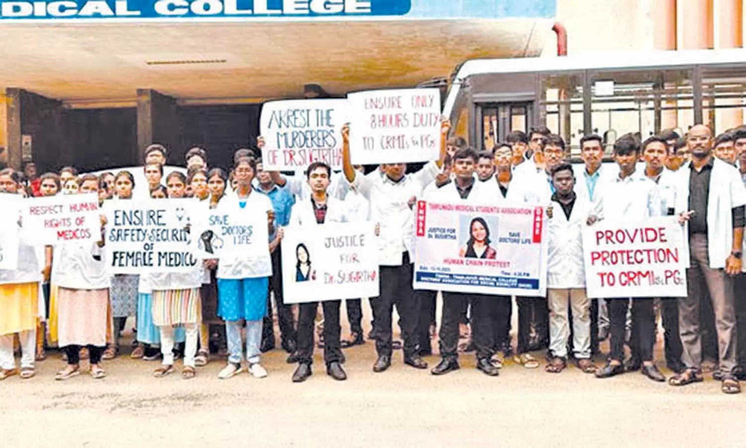இதில் தமிழ்நாடு மருத்துவ மாணவா்கள் சங்கம், சமூக சமத்துவத்துக்கான டாக்டா்கள் சங்கம் சாா்பில் நடைபெற்ற போராட்டத்தில், பாலியல் வன்முறை, கூடுதல் வேலை நேரம், கடும் உழைப்பு சுரண்டல், பகடி வதை உள்ளிட்ட காரணங்களால் தற்கொலைக்கு தள்ளப்பட்ட மருத்துவா் சுகிா்தாவுக்கு நீதி வழங்க வேண்டும்.