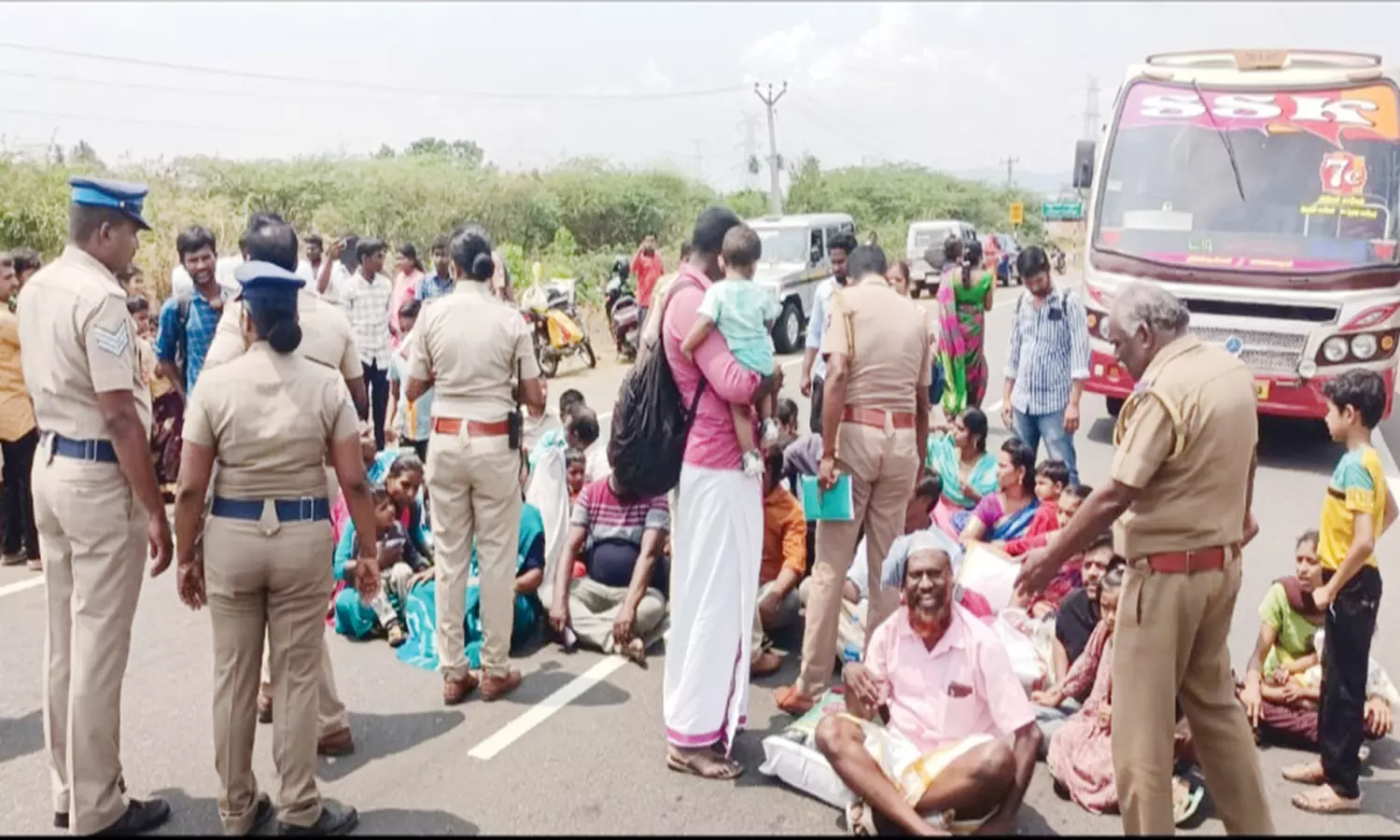 கைக்குழந்தைகளுடன் சாலை மறியலில் ஈடுபட்டவர்களை படத்தில் காணலாம்.