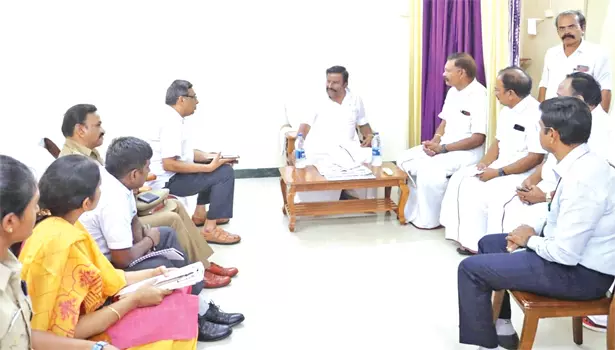 கலெக்டர் கார்மேகம் மற்றும் உயர் அதிகாரிகளுடன் அமைச்சர் கே.என்.நேரு ஆலோசனை நடத்திய காட்சி.