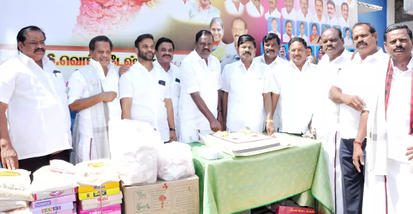 - பிரமாண்ட கேக் வெட்டி கட்சி நிர்வாகிகள் மற்றும் பொதுமக்களுக்கு வழங்கினார்.