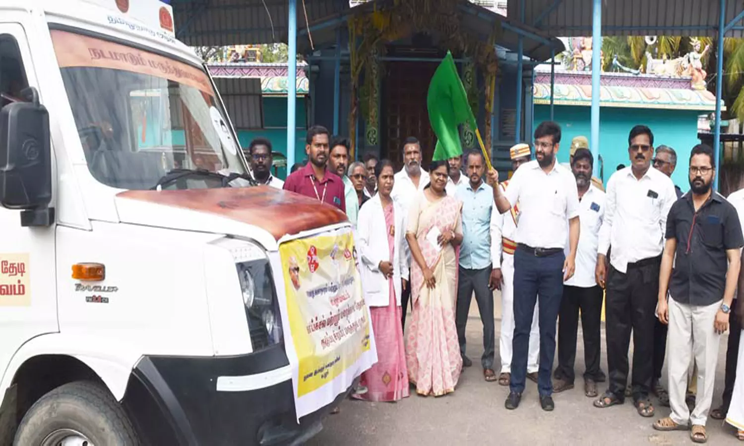 நடமாடும் மருத்துவ வாகனங்களை கலெக்டர் அருண் தம்புராஜ் கொடியசைத்து தொடங்கி வைத்த காட்சி.