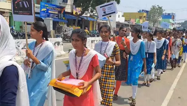 பேரணியில் கலந்து கொண்ட மாணவிகள்.