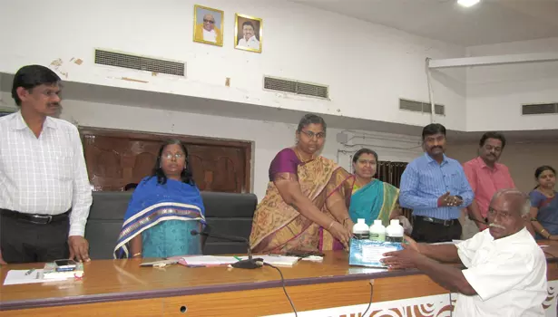 கூட்டத்தில் விவசாயிகளுக்கு வேளாண் இடுபொருட்களை கலெக்டர் உமா வழங்கிய காட்சி.