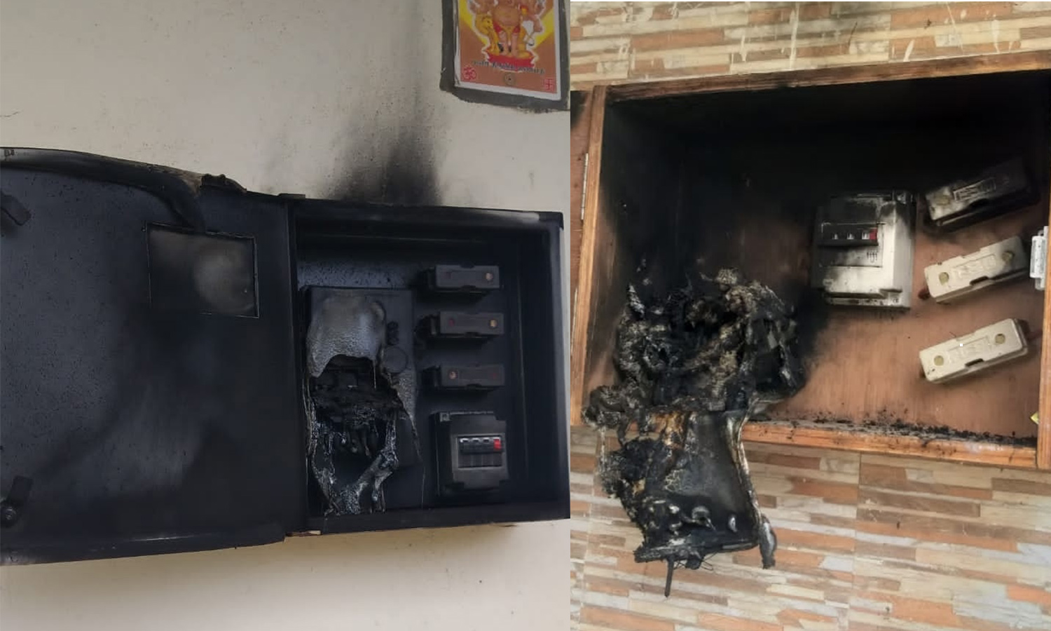 தீ பிடித்து சேதமடைந்துள்ள மீட்டர் பெட்டிகள்.