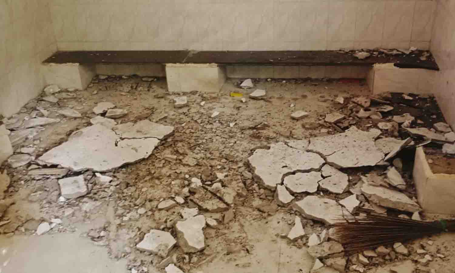 - அறையின் மேற்கூரை பாதியளவு பெயர்ந்து கீழே விழுந்தும் எழும்பு கூடு போல் கம்பிகள் ஆங்காங்கே தெரிகிறது.