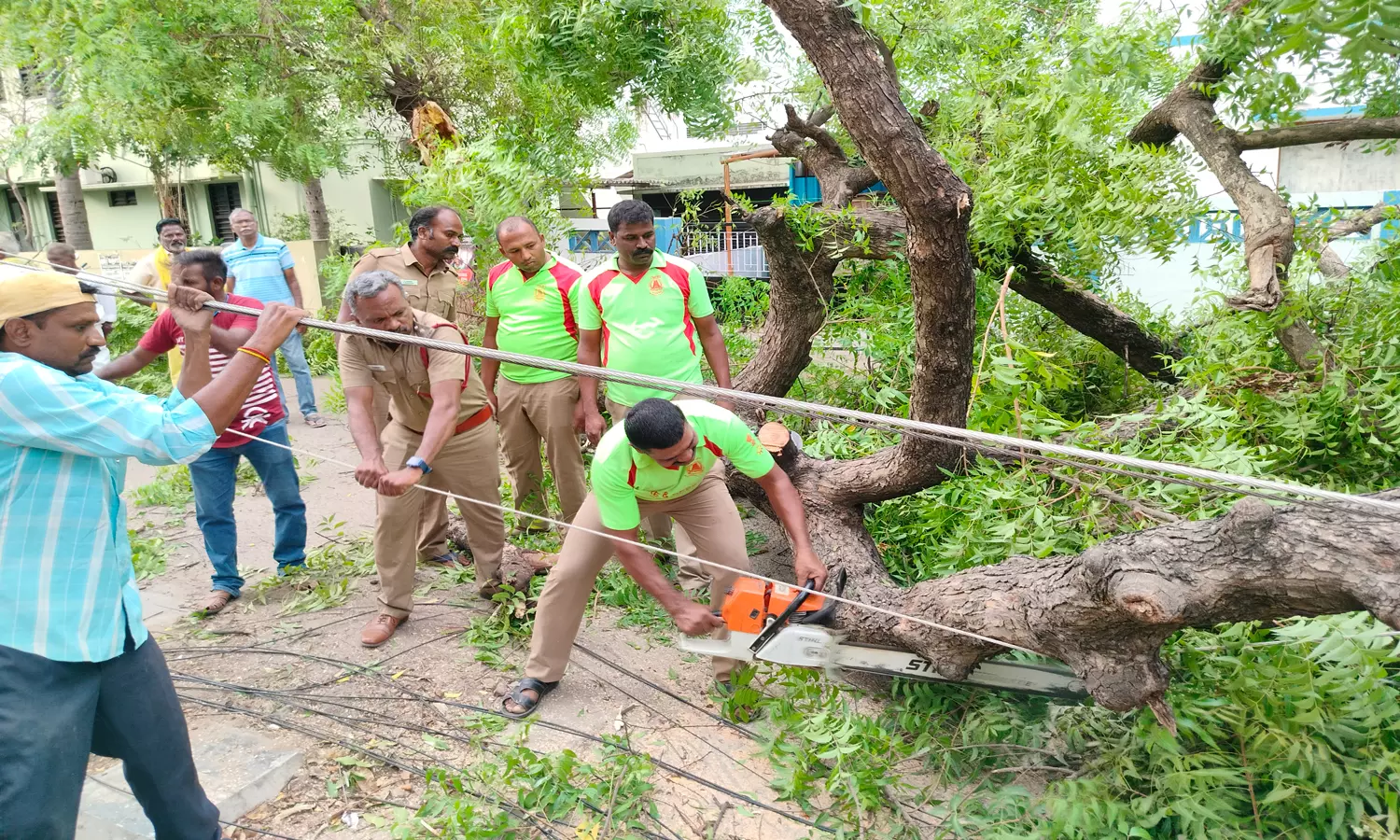 முறிந்து விழுந்த வேப்பமர கிளையை அகற்றும் பணியில் ஈடுபட்ட தீயணைப்புத்துறையினர்.