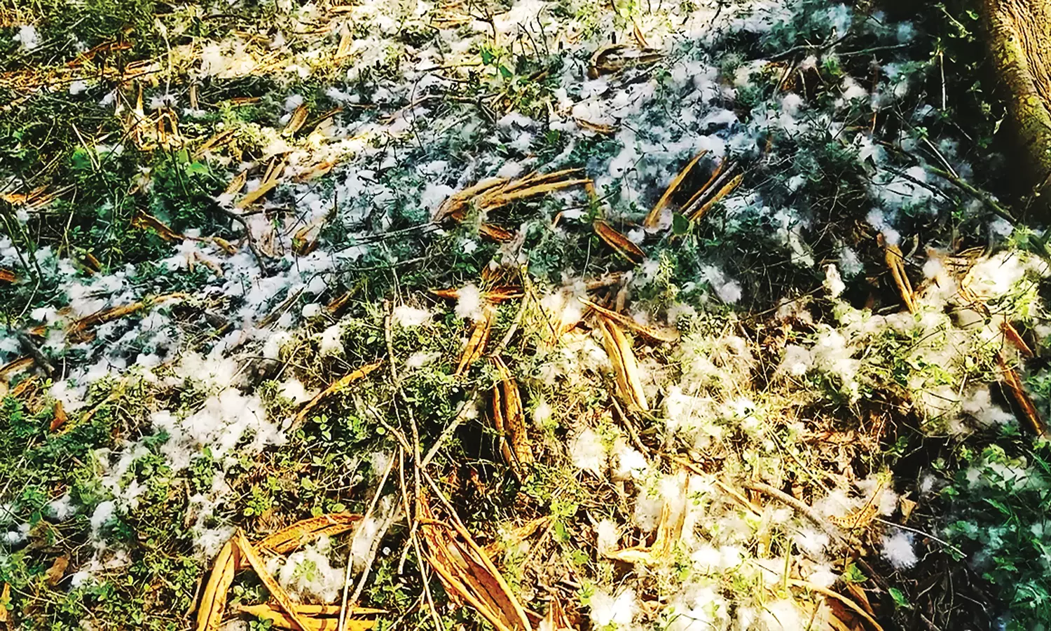 போடி அருகே இலவம் மரத்தில் காய்கள் வெடித்து சிதறிகிடக்கும் காட்சி.