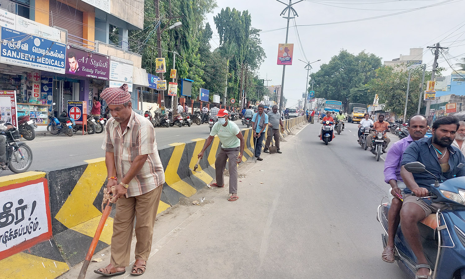 சாலையின் இரு புறங்களிலும் மண் துகள் அகற்றும் பணி தீவிரமாக நடந்து வரும் காட்சி.