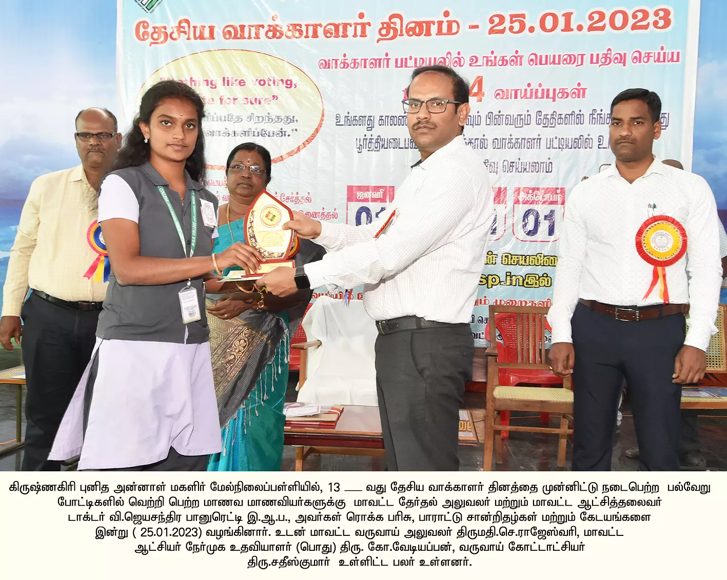 இதில் கலெக்டர் ஜெயசந்திரபானுரெட்டி கலந்து கொண்டு, போட்டிகளில் வெற்றி பெற்ற 12 பள்ளி மற்றும் கல்லூரி மாணவ, மாணவிகளுக்கு ரூ.14 ஆயிரம் மதிப்பிலான ரொக்கப்பரிசு, கேடயம் மற்றும் பாராட்டுச் சான்றிதழ்களும், வினாடி வினா போட்டிகளில் வெற்றி பெற்ற மாணவர்களுக்கு பாராட்டுச் சான்றிதழ்களும், கோலப்போட்டியில் வெற்றி பெற்ற 10 மகளிர் சுய உதவிக்குழுக்களுக்கு ரூ.19 ஆயிரம் மதிப்பில் ரொக்கப்பரிசு, கேடயம் மற்றும் பாராட்டுச் சான்றிதழ்களும், வாக்காளர் அடையாள அட்டையுடன் ஆதார் எண் இணைக்கும் பணியில் சிறப்பாக செயல்பட்ட 6 வாக்குச்சாவடி நிலை அலுவலர்களுக்கு பாராட்டுச் சான்றிதழ்களை வழங்கினார்.