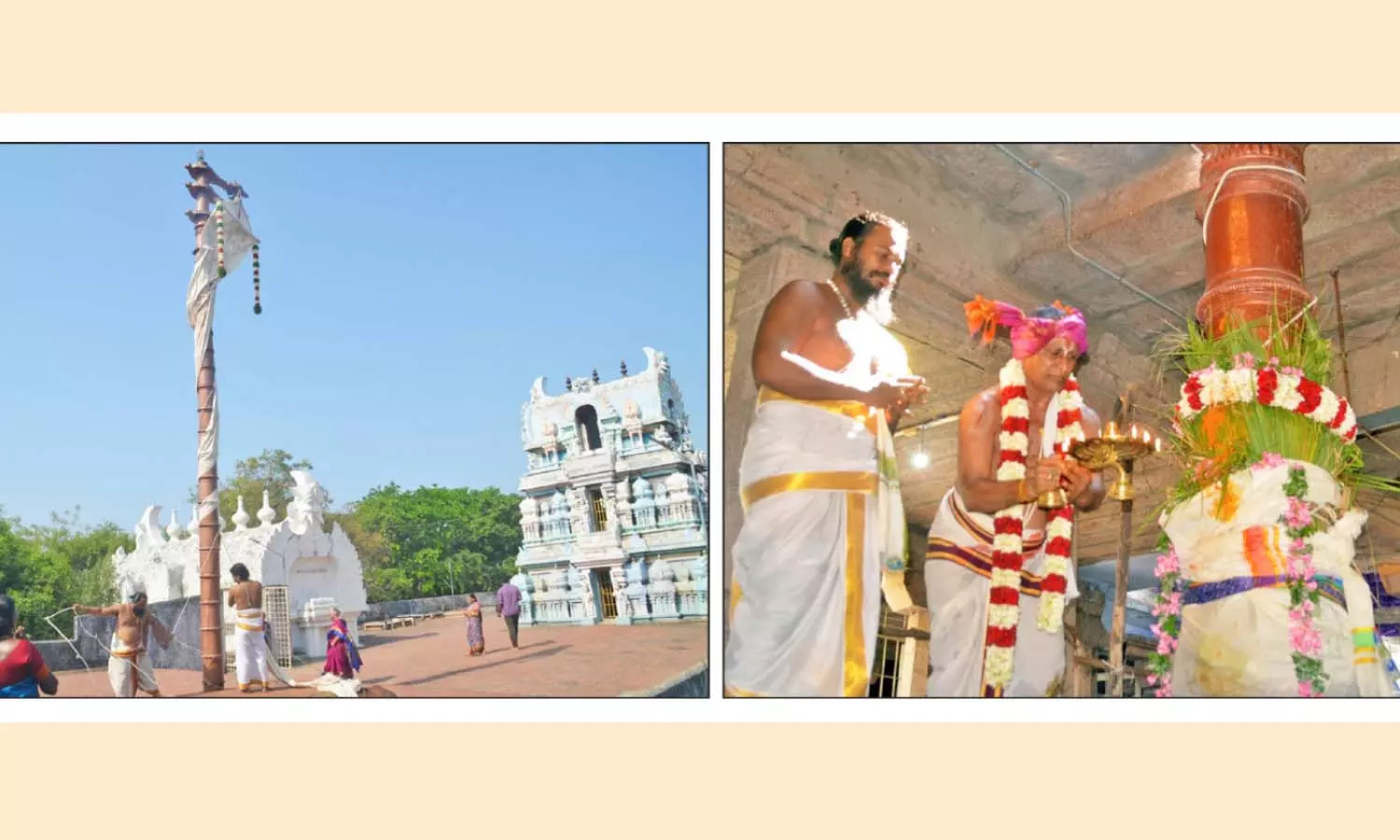 கருடக்கொடியானது சக்கரத்தாழ்வாருடன் சீவிலியில் 4 மாட ரத வீதிகளில் வலம் வந்தது. தொடா்ந்து கொடிமரத்திற்கும், கொடிப் பட்டத்திற்கும் பூஜைகள் நடைபெற்று, வேத மந்திரங்கள் முழங்க கொடியேற்றப்பட்டது.