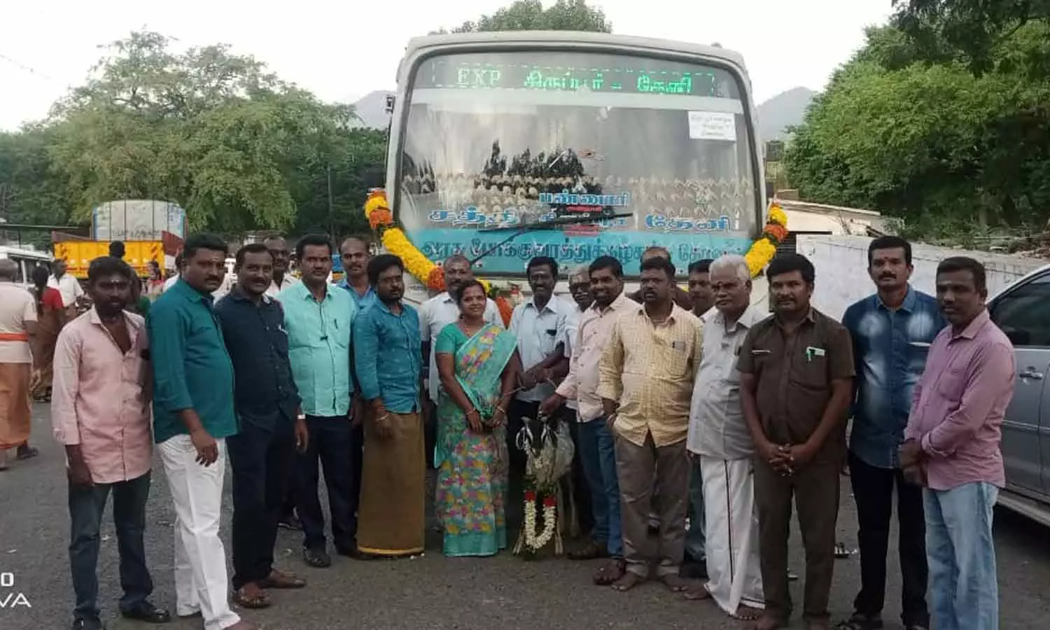 அரசு பஸ் முன்பு கிடாயுடன் நின்ற பயணிகளை படத்தில் காணலாம்.