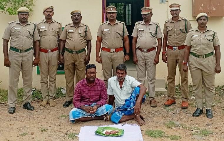ஆலம்பாடி கிராமத்தை சேர்ந்த பிச்சைப்பிள்ளை மகன் சங்கர் (வயது 47), தங்கராஜ் மகன் சுப்ரமணியம் (44) என்பதும், சங்கரின் வயல்காட்டில் பாதுகாப்பாக வளர்க்கப்பட்ட நாய், மக்காசோள பயிர் காட்டிற்குள் வந்த காட்டுப்பன்றியை கடித்து குதறியதால் இறந்துபோனது. நாங்கள் அதனை எடுத்து சமைப்பதற்காக கறியை கூறுப்போட ்டுக்கொண்டிருந்தோம் என்றனர்.