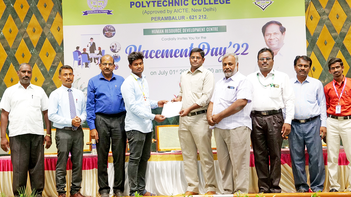 பெரம்பலூர் தனலட்சுமி சீனிவாசன் பாலிடெக்னிக் கல்லூரியில் மனிதவள மேம்பாட்டுத்துறை சார்பில் வேலைவாய்ப்பு முகாம் மூலம் பணிக்கு தேர்ந்தெடுக்கப்பட்டோருக்கு பணிநியமன ஆணை வழங்கும் விழா நடந்தது.