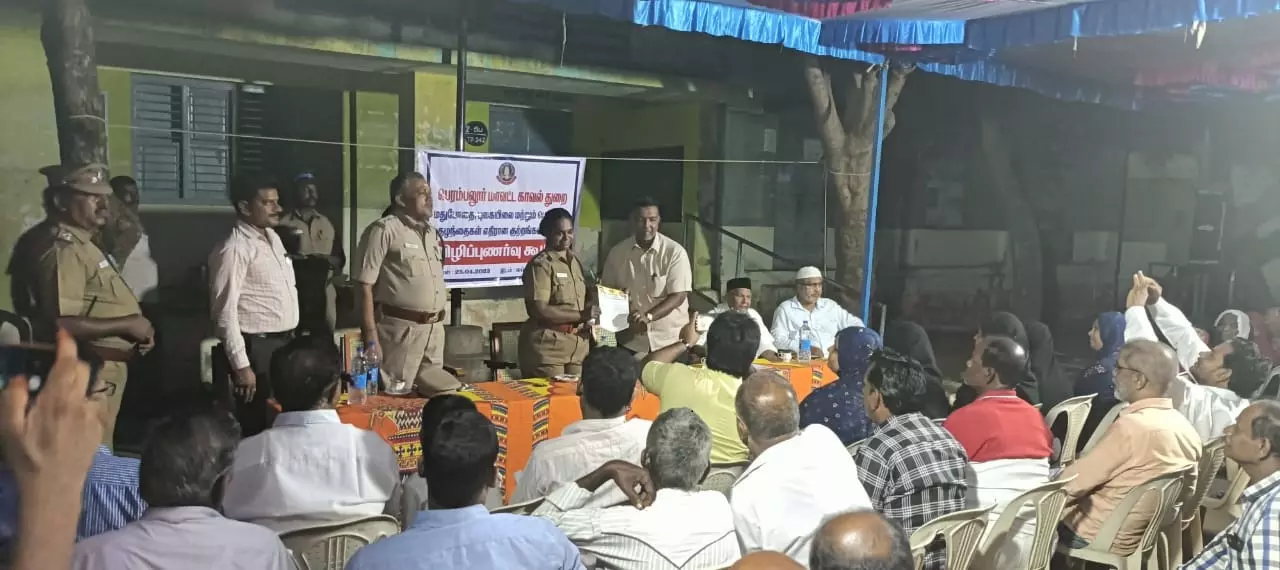 பெரம்பலூரை அடுத்த மங்களமேடு போலீஸ் சரகம் லெப்பைக்குடிகாடு பேரூராட்சி பகுதியில் மாவட்ட போலீஸ் அலுவலகம் சார்பில் குட்கா, கஞ்சா உள்ளிட்ட போதைப்பொருட்கள் ஒழிப்பு விழிப்புணர்வு நிகழ்ச்சியும், பெண்கள் மற்றும் குழந்தைகளுக்கு எதிரான குற்றங்கள் தடுப்பு குறித்த விழிப்புணர்வு கூட்டமும் நேற்று நடந்தது. நிகழ்ச்சிக்கு மாவட்ட போலீஸ் சூப்பிரண்டு ஷ்யாம்ளாதேவி தலைமை தாங்கி பேசும்போது பெரம்பலூர் மாவட்டத்தில் குற்றச்செயல்கள் குறைத்திட, இளைஞர்கள் அனைவரும் போதை பழக்கங்களுக்கு எதிரான உறுதிமொழியை ஏற்க வேண்டும். பெற்றோர்கள் தங்களது குழந்தைகளுக்கு பிறர் தவறான கண்ணோட்டத்தில் தொடாமல் தங்களை பாதுகாத்து கொள்வது குறித்து விழிப்புணர்வு ஏற்படுத்த வேண்டும் என்று கூறினார். இந்த நிகழ்ச்சியில் மங்களமேடு உட்கோட்ட துணை சூப்பிரண்டு சீராளன், இன்ஸ்பெக்டர் நடராஜன், மாவட்ட தனிப்பிரிவு போலீஸ் இன்ஸ்பெக்டர் வெங்கடேஸ்வரன் மற்றும் சப்-இன்ஸ்பெக்டர்கள், பொதுமக்கள் உள்பட பலர் கலந்து கொண்டனர்.
