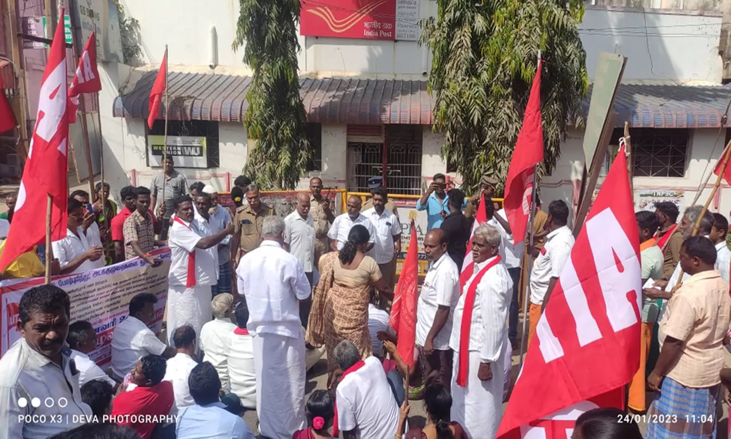 - ஏ.ஐ.டி.யு.சி. சார்பில் பண்ருட்டி தபால் நிலையம் முன்புமாவட்ட பொது செயலாளர் பன்னீர்செல்வம் தலைமையில் மறியல் போராட்டம் நடந்தது